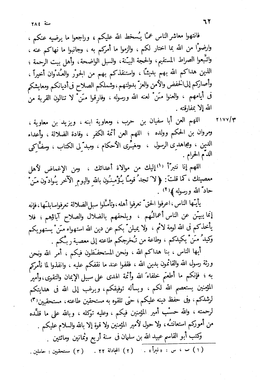 ايها الناس، بنا هداكم الله، ونحن المستحفظون فيكم، امر الله ونحن ورثه رسول الله والقائمون بدين الله، فقفوا عند ما نقفكم عليه، وانفذوا لما نأمركم به، فإنكم ما أطعتم خلفاء الله وائمه الهدى على سبيل الايمان والتقوى، وامير المؤمنين يستعصم الله لكم، ويسأله توفيقكم، ويرغب الى الله في هدايتكم لرشدكم، وفي حفظ دينه عليكم، حتى تلقوه به مستحقين طاعته، مستحقبين لرحمته، والله حسب امير المؤمنين فيكم، وعليه توكله، وبالله على ما قلده من أموركم استعانته، ولا حول لأمير المؤمنين ولا قوه الا بالله والسلام عليكم.