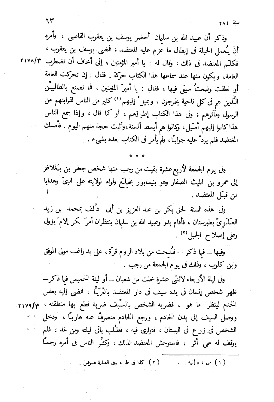 وذكر ان عبيد الله بن سليمان احضر يوسف بن يعقوب القاضى، وامره ان يعمل الحيله في ابطال ما عزم عليه المعتضد، فمضى يوسف بن يعقوب، فكلم المعتضد في ذلك، وقال له: يا امير المؤمنين، انى اخاف ان تضطرب العامه، ويكون منها عند سماعها هذا الكتاب حركه فقال: ان تحركت العامه او نطقت وضعت سيفي فيها، فقال: يا امير المؤمنين، فما تصنع بالطالبين الذين هم في كل ناحيه يخرجون، ويميل اليهم كثير من الناس لقرابتهم من الرسول وماثرهم، وفي هذا الكتاب اطراؤهم، او كما قال، وإذا سمع الناس هذا كانوا اليهم اميل، وكانوا هم ابسط السنه، واثبت حجه منهم اليوم فامسك المعتضد فلم يرد عليه جوابا، ولم يأمر في الكتاب بعده بشيء.