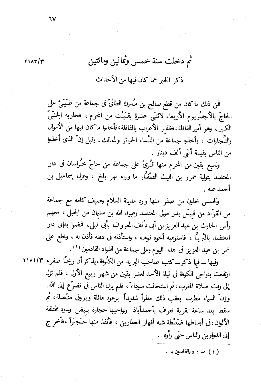 فمن ذلك ما كان من قطع صالح بن مدرك الطائي في جماعه من طيّئ على الحاج بالأجفر يوم الأربعاء لاثنتى عشره بقيت من المحرم، فحاربه الجنى الكبير، وهو امير القافلة، فظفر الاعراب بالقافلة، فأخذوا ما كان فيها من الأموال والتجارات، وأخذوا جماعه من النساء الحرائر والممالك وقيل ان الذى أخذوا من الناس بقيمة الفى الف دينار.