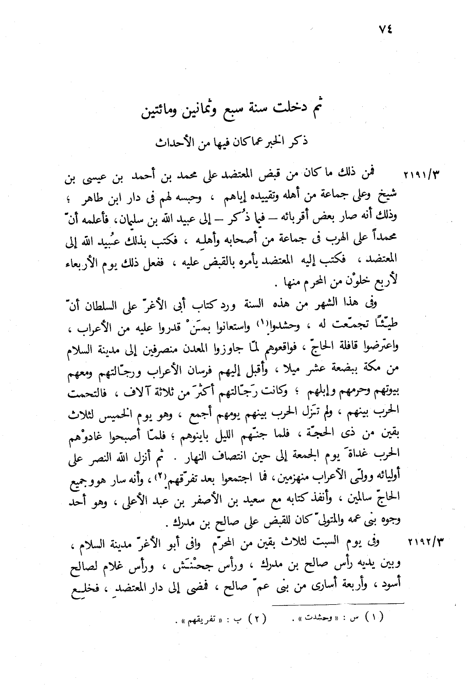 وفي هذا الشهر من هذه السنه ورد كتاب ابى الأغر على السلطان ان طيئا تجمعت له، وحشدوا واستعانوا بمن قدروا عليه من الاعراب، واعترضوا قافلة الحاج، فواقعوهم لما جاوزوا المعدن منصرفين الى مدينه السلام من مكة ببضعه عشر ميلا، واقبل اليهم فرسان الاعراب ورجالتهم ومعهم بيوتهم وحرمهم وابلهم، وكانت رجالتهم اكثر من ثلاثة آلاف، فالتحمت الحرب بينهم، ولم تزل الحرب بينهم يومهم اجمع، وهو يوم الخميس لثلاث بقين من ذي الحجه، فلما جنهم الليل باينوهم، فلما أصبحوا غادوهم الحرب غداه يوم الجمعه الى حين انتصاف النهار ثم انزل الله النصر على اوليائه وولى الاعراب منهزمين، فما اجتمعوا بعد تفرقهم، وانه سار هو وجميع الحاج سالمين، وانفذ كتابه مع سعيد بن الأصفر بن عبد الأعلى، وهو احد وجوه بنى عمه والمتولى كان للقبض على صالح بن مدرك.