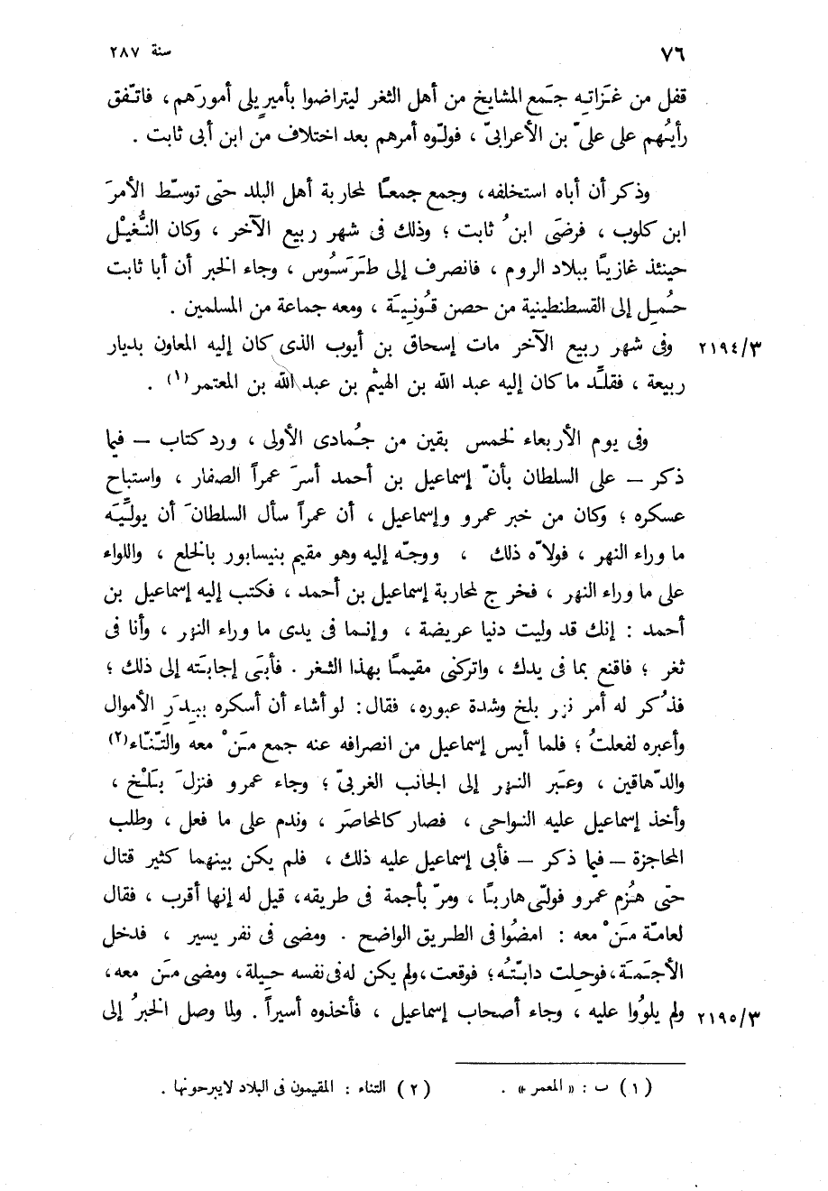 وذكر ان أباه استخلفه، وجمع جمعا لمحاربه اهل البلد حتى توسط الأمر ابن كلوب، فرضى ابن ثابت، وذلك في شهر ربيع الآخر، وكان النغيل حينئذ غازيا ببلاد الروم، فانصرف الى طرسوس، وجاء الخبر ان أبا ثابت حمل الى القسطنطينية من حصن قونيه، ومعه جماعه من المسلمين.