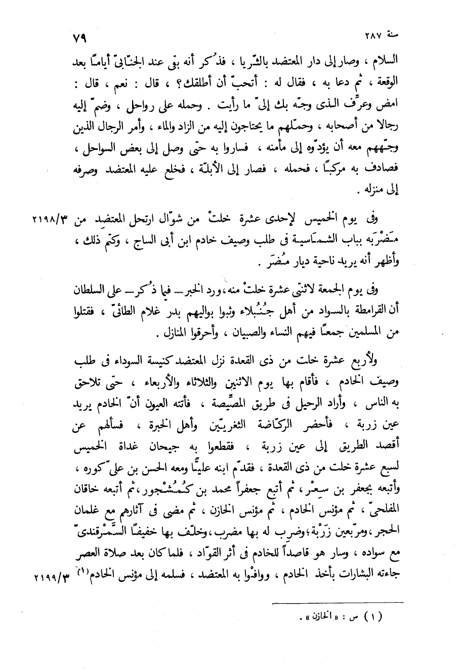 ولاربع عشره خلت من ذي القعده نزل المعتضد كنيسه السوداء في طلب وصيف الخادم، فأقام بها يوم الاثنين والثلاثاء والأربعاء، حتى تلاحق به الناس، واراد الرحيل في طريق المصيصة، فاتته العيون ان الخادم يريد عين زربه، فاحضر الركاضه الثغريين واهل الخبره، فسألهم عن اقصد الطريق الى عين زربه، فقطعوا به جيحان غداه الخميس لسبع عشره خلت من ذي القعده، فقدم ابنه عليا ومعه الحسن بن على كوره، واتبعه بجعفر بن سعر، ثم اتبع جعفرا محمد بن كمشجور، ثم اتبعه خاقان المفلحى، ثم مؤنس الخادم، ثم مؤنس الخازن، ثم مضى في آثارهم مع غلمان الحجر، ومر بعين زربه، وضرب له بها مضرب، وخلف بها خفيفا السمرقندي مع سواده، وسار هو قاصدا للخادم في اثر القواد، فلما كان بعد صلاه العصر جاءته البشارات بأخذ الخادم، ووافوا به المعتضد، فسلمه الى مؤنس الخادم