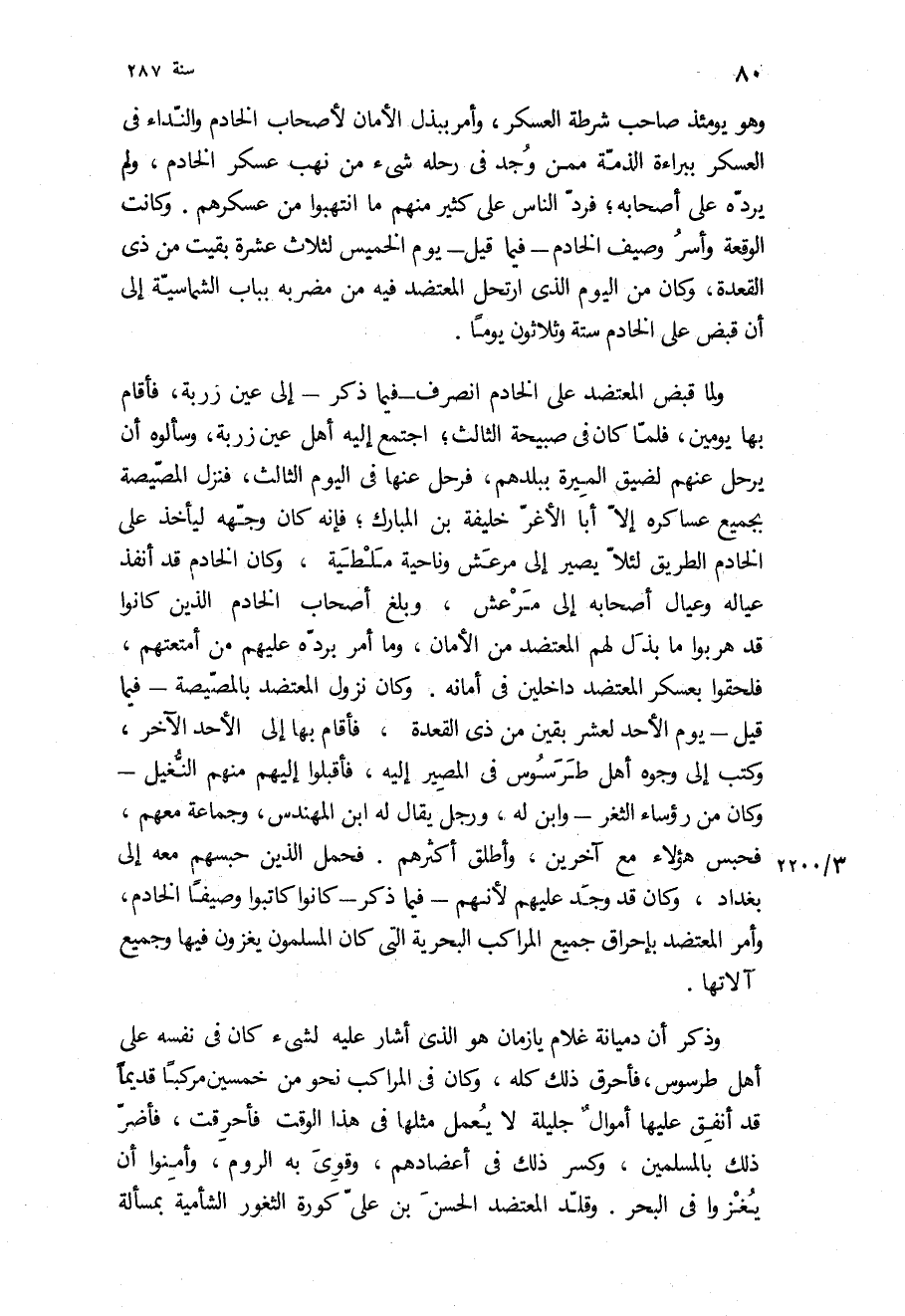 وذكر ان دميانه غلام يازمان هو الذى اشار عليه لشيء كان في نفسه على اهل طرسوس، فاحرق ذلك كله، وكان في المراكب نحو من خمسين مركبا قديما قد انفق عليها اموال جليله لا يعمل مثلها في هذا الوقت فاحرقت، فأضر ذلك بالمسلمين، وكسر ذلك في اعضادهم، وقوى به الروم، وأمنوا ان يغزوا في البحر وقلد المعتضد الحسن بن على كوره الثغور الشامية بمسلم