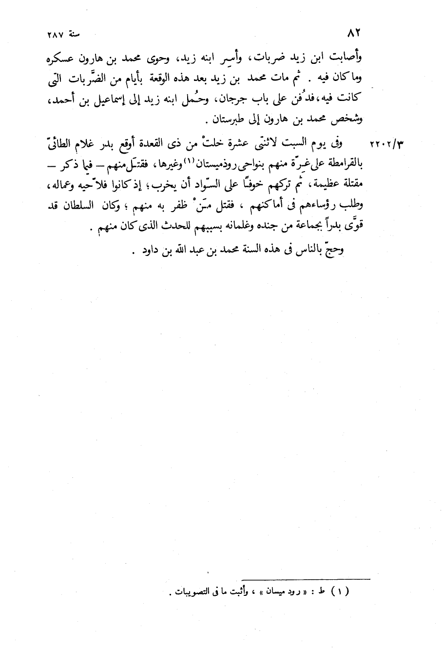 وفي يوم السبت لاثنتى عشره خلت من ذي القعده اوقع بدر غلام الطائي بالقرامطة على غره منهم بنواحي روذميستان وغيرها، فقتل منهم- فيما ذكر- مقتله عظيمه، ثم تركهم خوفا على السواد ان يخرب، إذ كانوا فلاحيه وعماله، وطلب رؤساءهم في أماكنهم، فقتل من ظفر به منهم، وكان السلطان قد قوى بدرا بجماعه من جنده وغلمانه بسببهم للحدث الذى كان منهم.