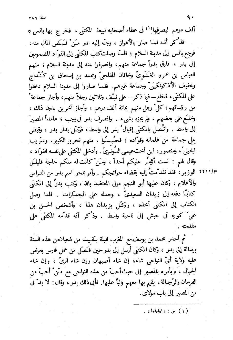 فذكر انه لما صار بالاهواز، وجه اليه بدر من قبض المال منه فرجع يانس الى مدينه السلام، فلما وصلت كتب المكتفي الى القواد المضمومين الى بدر، فارق بدرا جماعه منهم، وانصرفوا عنه الى مدينه السلام، منهم العباس بن عمرو الغنوي وخاقان المفلحى ومحمد بن إسحاق بن كنداج وخفيف الاذكوتكينى وجماعه غيرهم فلما صاروا الى مدينه السلام دخلوا على المكتفي، فخلع- فيما ذكر- على نيف وثلاثين رجلا منهم، واجاز جماعه من رؤسائهم، كل رجل منهم بمائه الف درهم، واجاز آخرين بدون ذلك، وخلع على بعضهم، ولم يجزه بشيء وانصرف بدر في رجب، عامدا المصير الى واسط واتصل بالمكتفى اقبال بدر الى واسط، فوكل بدار بدر، وقبض على جماعه من غلمانه وقواده، فحبسوا، منهم نحرير الكبير، وعريب الجبلي، ومنصور، ابن اخت عيسى النوشرى وادخل المكتفي على نفسه القواد، وقال لهم: لست اؤمر عليكم أحدا، ومن كانت له منكم حاجه فليلق الوزير، فقد تقدمت اليه بقضاء حوائجكم وامر بمحو اسم بدر من التراس والاعلام، وكان عليها ابو النجم مولى المعتضد بالله، وكتب بدر الى المكتفي كتابا دفعه الى زيدان السعيدي، وحمله على الجمازات فلما وصل الكتاب الى المكتفي اخذه، ووكل بزيدان هذا، واشخص الحسن بن على كوره في جيش الى ناحيه واسط وذكر انه قدمه المكتفي على مقدمته.