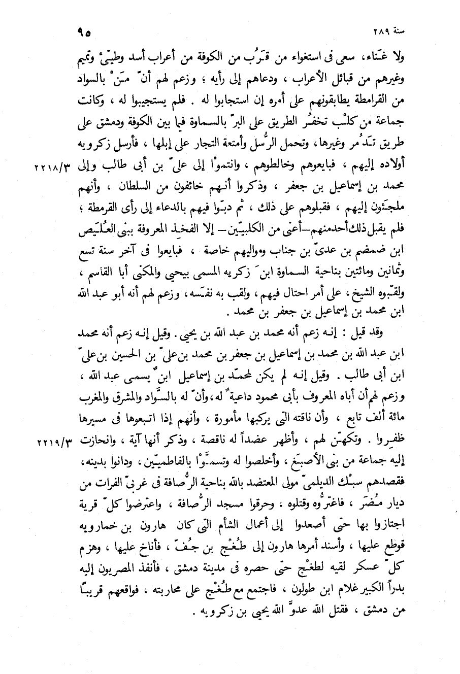 ولا غناء، سعى في استغواء من قرب من الكوفه من اعراب اسد وطيّئ وتميم وغيرهم من قبائل الاعراب، ودعاهم الى رايه، وزعم لهم ان من بالسواد من القرامطة يطابقونهم على امره ان استجابوا له فلم يستجيبوا له، وكانت جماعه من كلب تخفر الطريق على البر بالسماوة فيما بين الكوفه ودمشق على طريق تدمر وغيرها، وتحمل الرسل وامتعه التجار على ابلها، فأرسل زكرويه اولاده اليهم، فبايعوهم وخالطوهم، وانتموا الى على بن ابى طالب والى محمد بن اسماعيل بن جعفر، وذكروا انهم خائفون من السلطان، وانهم ملجئون اليهم، فقبلوهم على ذلك، ثم دبوا فيهم بالدعاء الى راى القرمطة، فلم يقبل ذلك احد منهم- اعنى من الكلبيين- الا الفخذ المعروفه ببني العليص ابن ضمضم بن عدى بن جناب ومواليهم خاصه، فبايعوا في آخر سنه تسع وثمانين ومائتين بناحيه السماوه ابن زكرويه المسمى بيحيى والمكنى أبا القاسم، ولقبوه الشيخ، على امر احتال فيهم، ولقب به نفسه، وزعم لهم انه ابو عبد الله ابن محمد بن اسماعيل بن جعفر بن محمد وقد قيل: انه زعم انه محمد بن عبد الله بن يحيى وقيل انه زعم انه محمد ابن عبد الله بن محمد بن إسماعيل بن جعفر بن مُحَمَّدِ بْنِ عَلِيِّ بْنِ الْحُسَيْنِ بْنِ عَلِيٍّ ابن ابى طالب وقيل انه لم يكن لمحمد بن اسماعيل ابن يسمى عبد الله، وزعم لهم ان أباه المعروف بابى محمود داعيه له، وان له بالسواد والمشرق والمغرب مائه الف تابع، وان ناقته التي يركبها مأمورة، وانهم إذا اتبعوها في مسيرها ظفروا وتكهن لهم، واظهر عضدا له ناقصه، وذكر انها آيه، وانحازت اليه جماعه من بنى الأصبغ، وأخلصوا له وتسموا بالفاطميين، ودانوا بدينه، فقصدهم سبك الديلمى مولى المعتضد بالله بناحيه الرصافه في غربي الفرات من ديار مضر، فاغتروه وقتلوه، وحرقوا مسجد الرصافه، واعترضوا كل قريه اجتازوا بها حتى اصعدوا الى اعمال الشام التي كان هارون بن خمارويه قوطع عليها، واسند امرها هارون الى طغج بن جف، فأناخ عليها، وهزم كل عسكر لقيه لطغج حتى حصره في مدينه دمشق، فانفذ المصريون اليه بدرا الكبير غلام ابن طولون، فاجتمع مع طغج على محاربته، فواقعهم قريبا من دمشق، فقتل الله عدو الله يحيى بن زكرويه