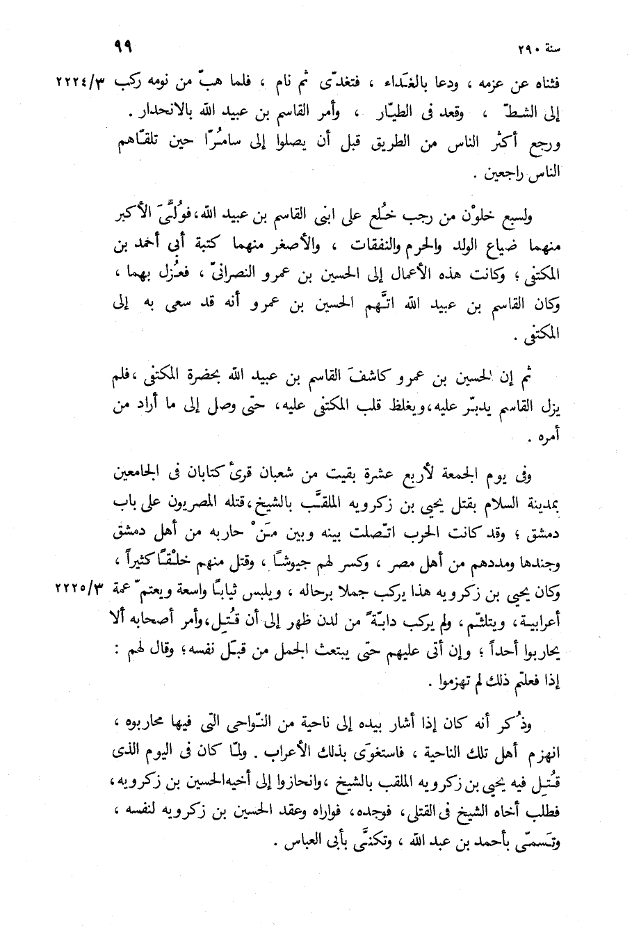 وفي يوم الجمعه لاربع عشره بقيت من شعبان قرئ كتابان في الجامعين بمدينه السلام بقتل يحيى بن زكرويه الملقب بالشيخ، قتله المصريون على باب دمشق، وقد كانت الحرب اتصلت بينه وبين من حاربه من اهل دمشق وجندها ومددهم من اهل مصر، وكسر لهم جيوشا، وقتل منهم خلقا كثيرا، وكان يحيى بن زكرويه هذا يركب جملا برحاله، ويلبس ثيابا واسعه ويعتم عمه اعرابيه، ويتلثم، ولم يركب دابه من لدن ظهر الى ان قتل، وامر اصحابه الا يحاربوا أحدا، وان اتى عليهم حتى يبتعث الجمل من قبل نفسه، وقال لهم: