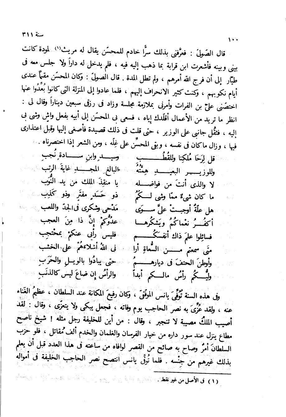 وفي هذه السنه توفى يانس الموفقى، وكان رفيع المكانه عند السلطان، عظيم الغناء عنه، ولقد عزى به نصر الحاجب يوم وفاته، فجعل يبكى ولا يتعزى، وقال: لقد اصيب الملك مصيبه لا تنجبر، وقال: من اين للخليفة رجل مثله! شيخ ناصح مطاع ينزل عند سور داره من خيار الفرسان والغلمان والخدم الف مقاتل، فلو حزب السلطان امر وصاح به صائح من القصر لوافاه من ساعته في هذا العدد قبل ان يعلم بذلك غيرهم من جنسه فلما توفى يانس انتصح نصر الحاجب الخليفة في أمواله