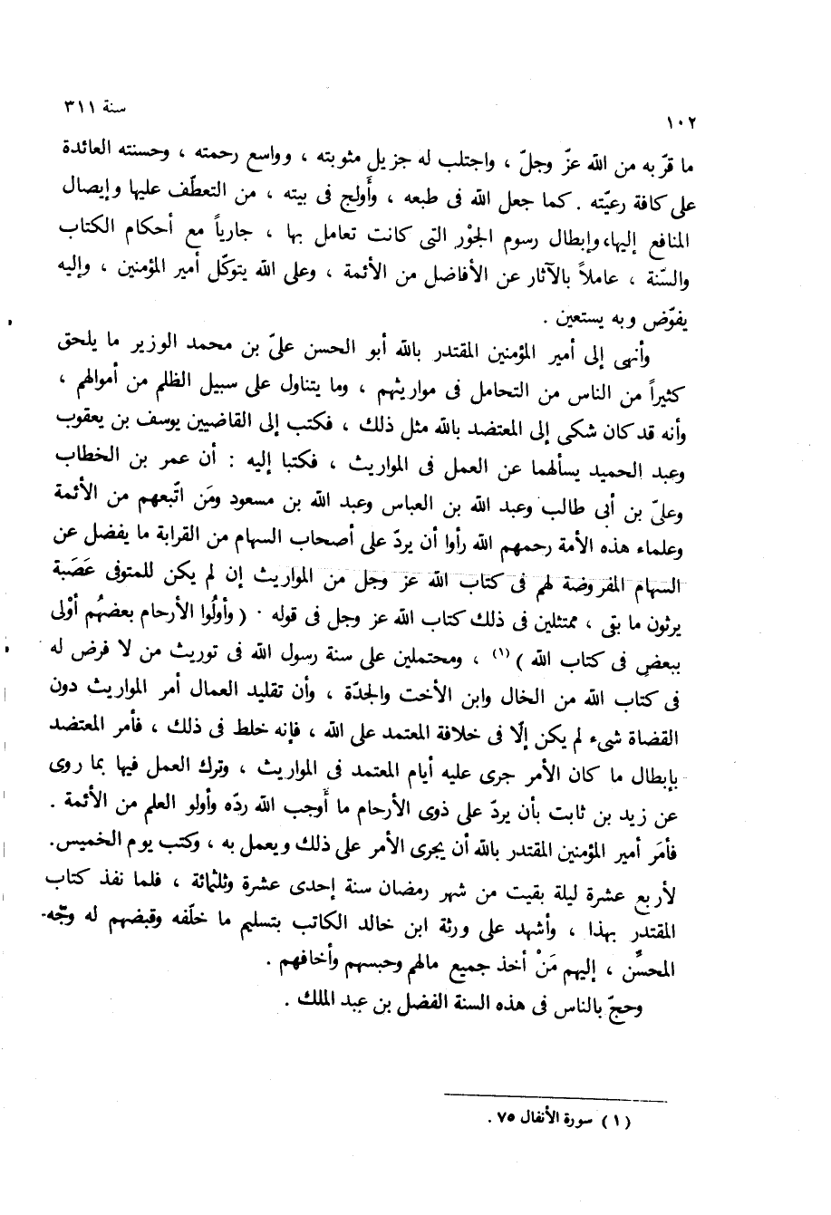 وانهى الى امير المؤمنين المقتدر بالله ابو الحسن على بن محمد الوزير ما يلحق كثيرا من الناس من التحامل في مواريثهم، وما يتناول على سبيل الظلم من أموالهم، وانه قد كان شكى الى المعتضد بالله مثل ذلك، فكتب الى القاضيين يوسف بن يعقوب وعبد الحميد يسالهما عن العمل في المواريث، فكتبا اليه: ان عُمَرَ بْنَ الْخَطَّابِ وَعَلِيَّ بْنَ أَبِي طَالِبٍ وعبد الله بن العباس وعبد الله بن مسعود ومن اتبعهم من الأئمة وعلماء هذه الامه رحمهم الله رأوا ان يرد على اصحاب السهام من القرابة ما يفضل عن السهام المفروضه لهم في كتاب الله عز وجل من المواريث ان لم يكن للمتوفى عصبه يرثون ما بقي، ممتثلين في ذلك كتاب الله عز وجل في قوله وَأُولُوا الْأَرْحامِ بَعْضُهُمْ أَوْلى بِبَعْضٍ فِي كِتابِ اللَّهِ، * ومحتملين على سنه رسول الله في توريث من لا فرض له في كتاب الله من الخال وابن الاخت والجده، وان تقليد العمال امر المواريث دون القضاه شيء لم يكن الا في خلافه المعتمد على الله، فانه خلط في ذلك، فامر المعتضد بابطال ما كان الأمر جرى عليه ايام المعتمد في المواريث، وترك العمل فيها بما روى عن زيد بن ثابت بان يرد على ذوى الارحام ما اوجب الله رده وأولو العلم من الأئمة.