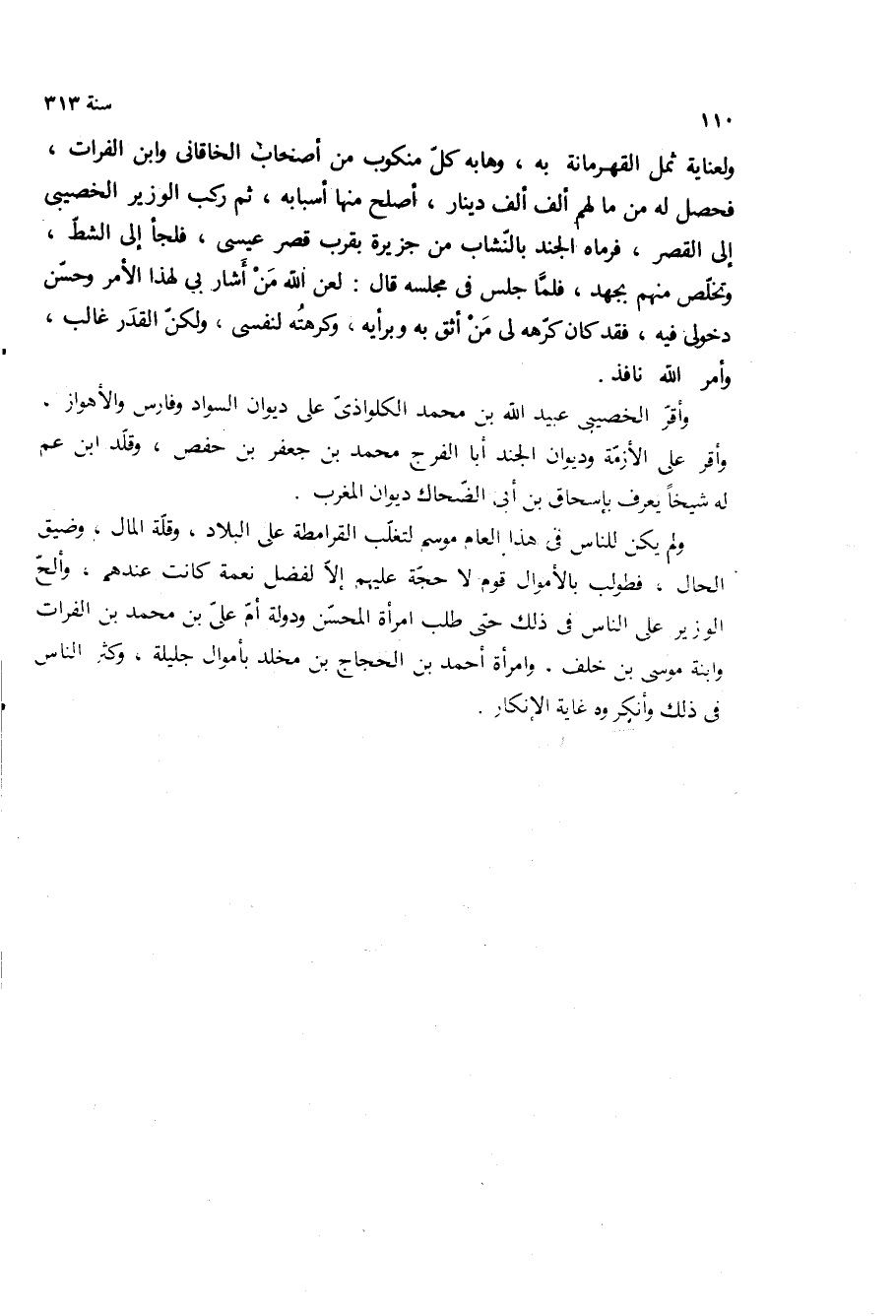 ولم يكن للناس في هذا العام موسم لتغلب القرامطة على البلاد، وقله المال، وضيق الحال، فطولب بالأموال قوم لا حجه عليهم الا لفضل نعمه كانت عندهم، والح الوزير على الناس في ذلك حتى طلب امراه المحسن ودوله أم على بن محمد بن الفرات وابنه موسى بن خلف، وامراه احمد بن الحجاج بن مخلد باموال جليله، وكثر الناس في ذلك وانكروه غاية الانكار.