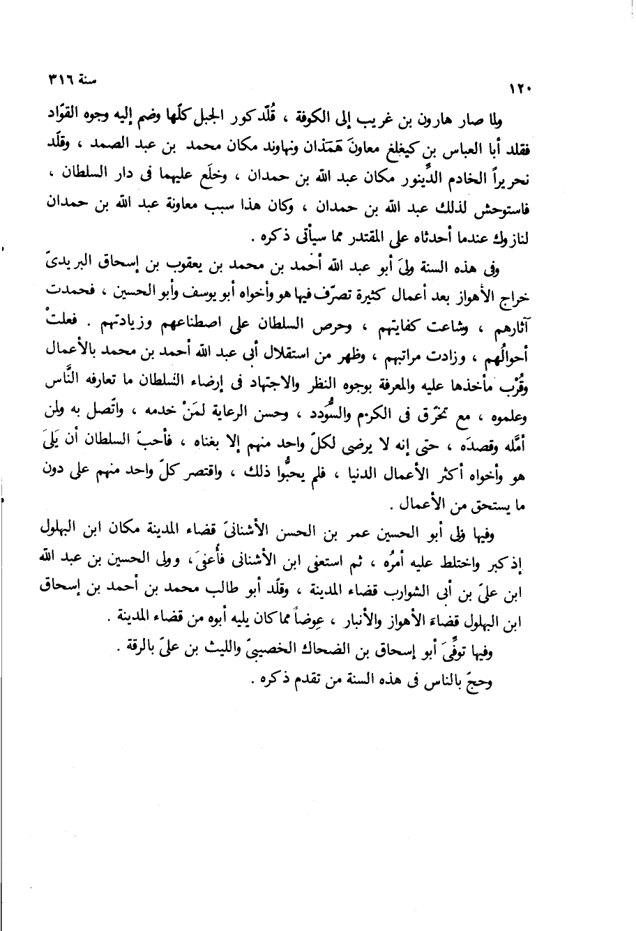 وفي هذه السنه ولى ابو عبد الله احمد بن محمد بن يعقوب بن إسحاق البريدى خراج الاهواز بعد اعمال كثيره تصرف فيها هو واخواه ابو يوسف وابو الحسين، فحمدت آثارهم، وشاعت كفايتهم، وحرص السلطان على اصطناعهم وزيادتهم فعلت أحوالهم، وزادت مراتبهم، وظهر من استقلال ابى عبد الله احمد بن محمد بالأعمال وقرب ماخذها عليه والمعرفة بوجوه النظر والاجتهاد في إرضاء السلطان ما تعارفه الناس وعلموه، مع تخرق في الكرم والسودد، وحسن الرعاية لمن خدمه، واتصل به ولمن امله وقصده، حتى انه لا يرضى لكل واحد منهم الا بغناه، فأحب السلطان ان يلى هو واخواه اكثر الاعمال الدنيا، فلم يحبوا ذلك، واقتصر كل واحد منهم على دون ما يستحق من الاعمال.