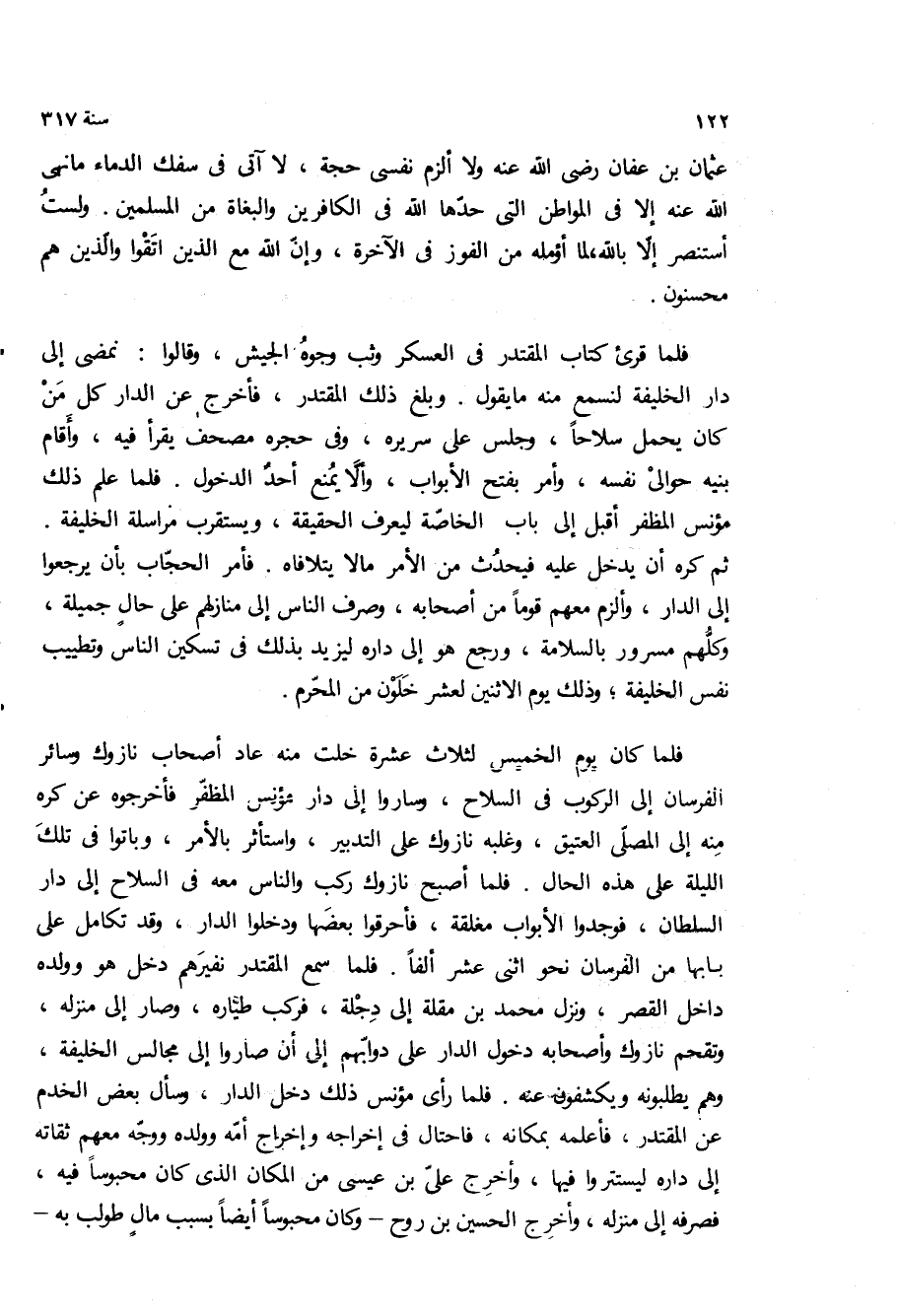 فلما قرئ كتاب المقتدر في العسكر وثب وجوه الجيش، وقالوا: نمضي الى دار الخليفة لنسمع منه ما يقول وبلغ ذلك المقتدر، فاخرج عن الدار كل من كان يحمل سلاحا، وجلس على سريره، وفي حجره مصحف يقرا فيه، واقام بنيه حوالى نفسه، وامر بفتح الأبواب، والا يمنع احد الدخول فلما علم ذلك مؤنس المظفر اقبل الى باب الخاصة ليعرف الحقيقة، ويستقرب مراسله الخليفة ثم كره ان يدخل عليه فيحدث من الأمر مالا يتلافاه فامر الحجاب بان يرجعوا الى الدار، والزم معهم قوما من اصحابه، وصرف الناس الى منازلهم على حال جميله، وكلهم مسرور بالسلامة، ورجع هو الى داره ليزيد بذلك في تسكين الناس وتطييب نفس الخليفة، وذلك يوم الاثنين لعشر خلون من المحرم.