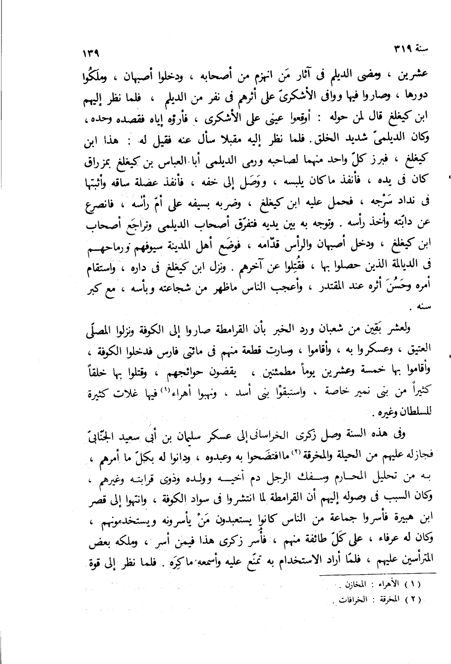 عشرين، ومضى الديلم في آثار من انهزم من اصحابه، ودخلوا أصبهان، وملكوا دورها، وصاروا فيها ووافى الاشكرى على أثرهم في نفر من الديلم، فلما نظر اليهم ابن كيغلغ قال لمن حوله: أوقعوا عيني على الاشكرى، فاروه اياه فقصده وحده، وكان الديلمى شديد الخلق فلما نظر اليه مقبلا سال عنه فقيل له: هذا ابن كيغلغ، فبرز كل واحد منهما لصاحبه ورمى الديلمى أبا العباس بن كيغلغ بمزراق كان في يده، فانفذ ما كان يلبسه، ووصل الى خفه، فانفذ عضله ساقه وأثبتها في نداد سرجه، فحمل عليه ابن كيغلغ، وضربه بسيفه على أم راسه، فانصرع عن دابته وأخذ راسه وتوجه به بين يديه فتفرق اصحاب الديلمى وتراجع اصحاب ابن كيغلغ، ودخل أصبهان والراس قدامه، فوضع اهل المدينة سيوفهم ورماحهم في الديالمة الذين حصلوا بها، فقتلوا عن آخرهم ونزل ابن كيغلغ في داره، واستقام امره وحسن اثره عند المقتدر، واعجب الناس ما ظهر من شجاعته وبأسه، مع كبر سنه.