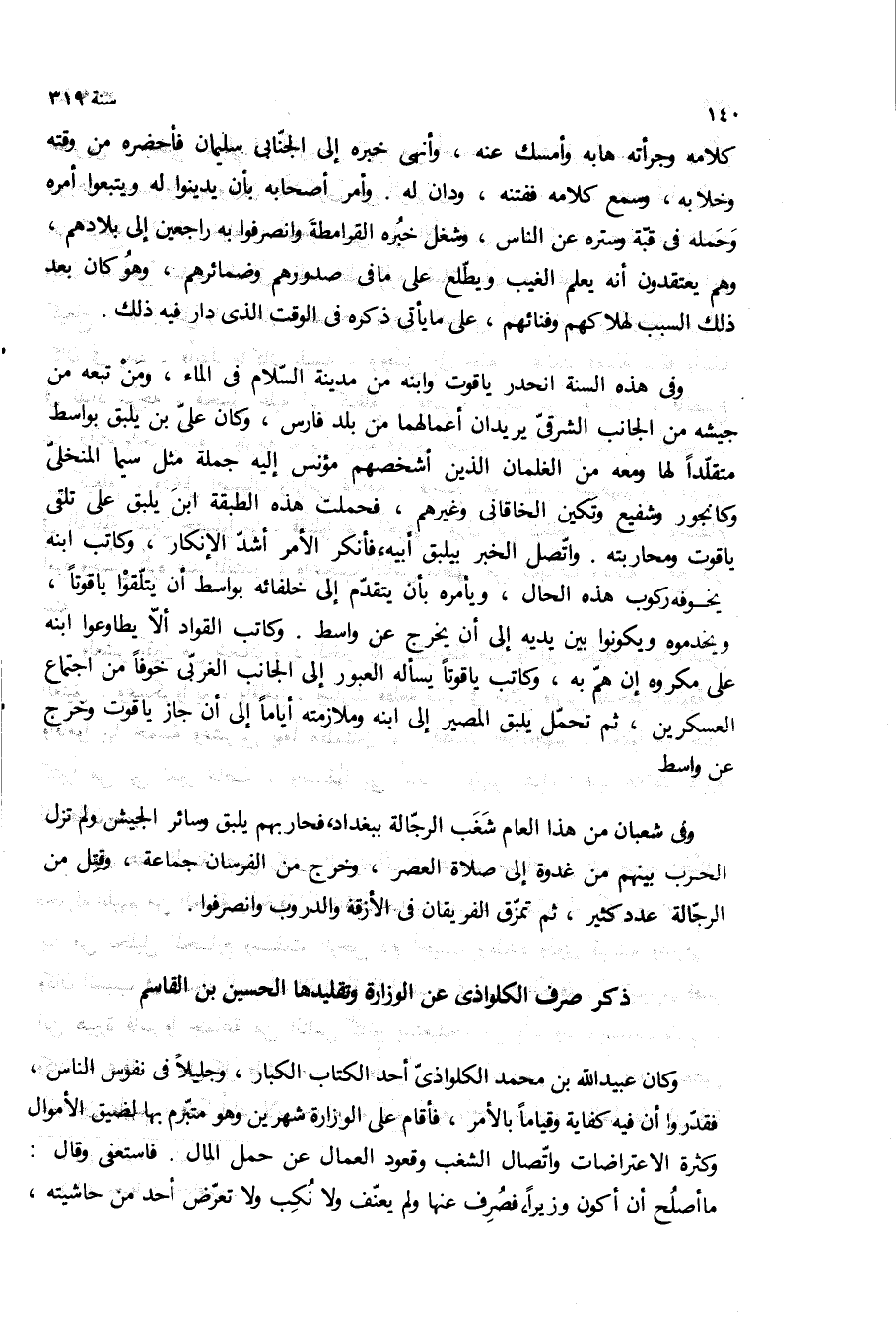 وفي هذه السنه انحدر ياقوت وابنه من مدينه السلام في الماء، ومن تبعه من جيشه من الجانب الشرقى يريدان أعمالهما من بلد فارس، وكان على بن يلبق بواسط متقلدا لها ومعه من الغلمان الذين اشخصهم مؤنس اليه جمله مثل سيما المنخلى وكانجور وشفيع وتكين الخاقانى وغيرهم، فحملت هذه الطبقة ابن يلبق على تلقى ياقوت ومحاربته واتصل الخبر بيلبق ابيه، فأنكر الأمر أشد الانكار، وكاتب ابنه يخوفه ركوب هذه الحال، ويأمره بان يتقدم الى خلفائه بواسط ان يتلقوا ياقوتا، ويخدموه ويكونوا بين يديه الى ان يخرج عن واسط وكاتب القواد الا يطاوعوا ابنه على مكروه ان هم به، وكاتب ياقوتا يسأله العبور الى الجانب الغربي خوفا من اجتماع العسكرين، ثم تحمل يلبق المصير الى ابنه وملازمته أياما الى ان جاز ياقوت وخرج عن واسط وفي شعبان من هذا العام شغب الرجاله ببغداد، فحاربهم يلبق وسائر الجيش ولم تزل الحرب بينهم من غدوه الى صلاه العصر، وخرج من الفرسان جماعه، وقتل من الرجاله عدد كثير، ثم تمزق الفريقان في الأزقة والدروب وانصرفوا