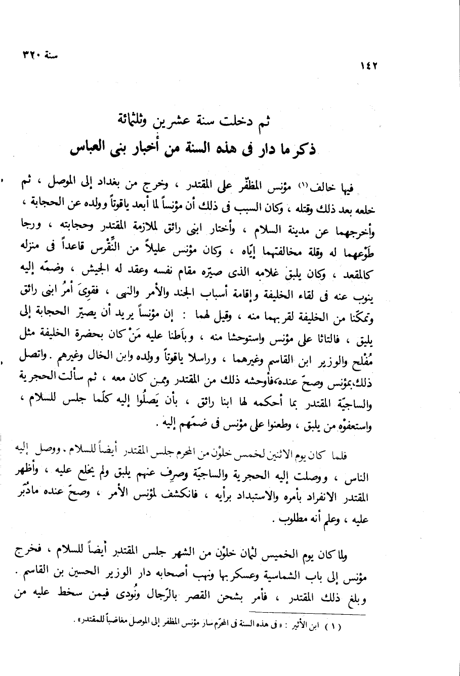 فيها خالف مؤنس المظفر على المقتدر، وخرج من بغداد الى الموصل، ثم خلعه بعد ذلك وقتله، وكان السبب في ذلك ان مؤنسا لما ابعد ياقوتا وولده عن الحجابه، وأخرجهما عن مدينه السلام، واختار ابنى رائق لملازمه المقتدر وحجابته، ورجا طوعهما له وقله مخالفتهما اياه، وكان مؤنس عليلا من النقرس قاعدا في منزله كالمقعد، وكان يلبق غلامه الذى صيره مقام نفسه وعقد له الجيش، وضمه اليه ينوب عنه في لقاء الخليفة واقامه اسباب الجند والأمر والنهى، فقوى امر ابنى رائق وتمكنا من الخليفة لقربهما منه، وقيل لهما: ان مؤنسا يريد ان يصير الحجابه الى يلبق، فالتاثا على مؤنس واستوحشا منه، وباطنا عليه من كان بحضره الخليفة مثل مفلح والوزير ابن القاسم وغيرهما، وراسلا ياقوتا وولده وابن الخال وغيرهم واتصل ذلك بمؤنس وصح عنده، فاوحشه ذلك من المقتدر وممن كان معه، ثم سالت الحجريه والساجيه المقتدر بما احكمه لها ابنا رائق، بان يصلوا اليه كلما جلس للسلام، واستعفوه من يلبق، وطعنوا على مؤنس في ضمهم اليه.