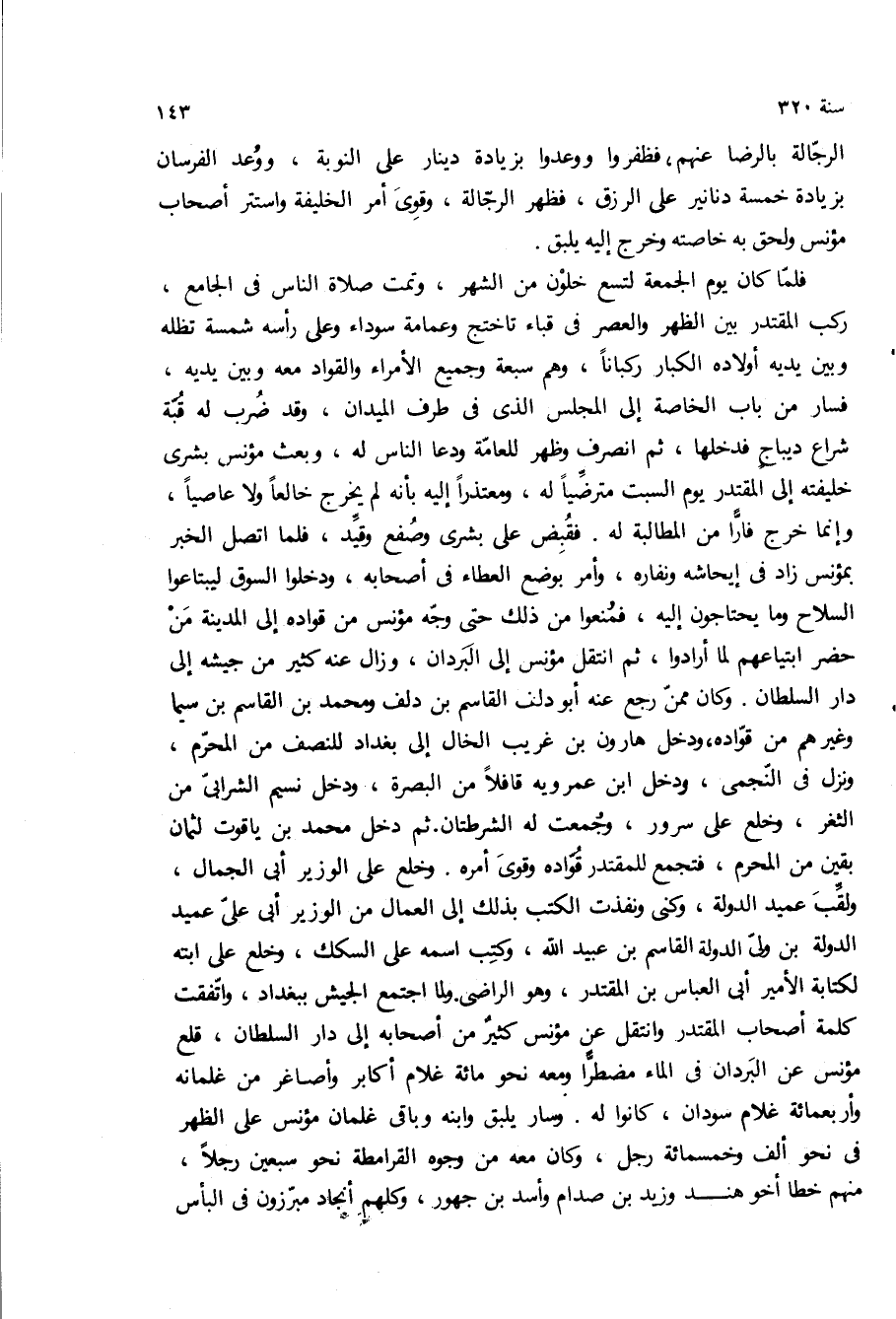 فلما كان يوم الجمعه لتسع خلون من الشهر، وتمت صلاه الناس في الجامع، ركب المقتدر بين الظهر والعصر في قباء تاختج وعمامة سوداء وعلى راسه شمسه تظله وبين يديه اولاده الكبار ركبانا، وهم سبعه وجميع الأمراء والقواد معه وبين يديه، فسار من باب الخاصة الى المجلس الذى في طرف الميدان، وقد ضرب له قبة شراع ديباج فدخلها، ثم انصرف وظهر للعامه ودعا الناس له، وبعث مؤنس بشرى خليفته الى المقتدر يوم السبت مترضيا له، ومعتذرا اليه بانه لم يخرج خالعا ولا عاصيا، وانما خرج فارا من المطالبه له فقبض على بشرى وصفع وقيد، فلما اتصل الخبر بمؤنس زاد في ايحاشه ونفاره، وامر بوضع العطاء في اصحابه، ودخلوا السوق ليبتاعوا السلاح وما يحتاجون اليه، فمنعوا من ذلك حتى وجه مؤنس من قواده الى المدينة من حضر ابتياعهم لما أرادوا، ثم انتقل مؤنس الى البردان، وزال عنه كثير من جيشه الى دار السلطان وكان ممن رجع عنه ابو دلف القاسم بن دلف ومحمد بن القاسم بن سيما وغيرهم من قواده، ودخل هارون بن غريب الخال الى بغداد للنصف من المحرم، ونزل في النجمى، ودخل ابن عمرويه قافلا من البصره، ودخل نسيم الشرابي من الثغر، وخلع على سرور، وجمعت له الشرطتان ثم دخل محمد بن ياقوت لثمان بقين من المحرم، فتجمع للمقتدر قواده وقوى امره وخلع على الوزير ابى الجمال، ولقب عميد الدولة، وكنى ونفذت الكتب بذلك الى العمال من الوزير ابى على عميد الدولة بن ولى الدولة القاسم بن عبيد الله، وكتب اسمه على السكك، وخلع على ابته لكتابه الأمير ابى العباس بن المقتدر، وهو الراضي ولما اجتمع الجيش ببغداد، واتفقت كلمه اصحاب المقتدر وانتقل عن مؤنس كثير من اصحابه الى دار السلطان، قلع مؤنس عن البردان في الماء مضطرا ومعه نحو مائه غلام اكابر واصاغر من غلمانه وأربعمائة غلام سودان، كانوا له وسار يلبق وابنه وباقى غلمان مؤنس على الظهر في نحو الف وخمسمائة رجل، وكان معه من وجوه القرامطة نحو سبعين رجلا، منهم خطا أخو هند وزيد بن صدام واسد بن جهور، وكلهم انجاد مبرزون في الباس