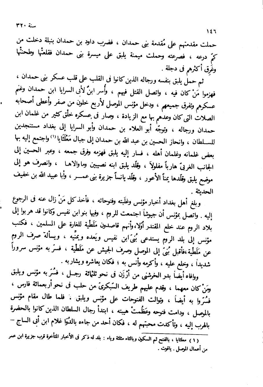 ثم حمل يلبق بنفسه ورجاله الذين كانوا في القلب على قلب عسكر بنى حمدان، فهزموا من كان فيه، واتصل القتل فيهم، واسر ابن لأبي السرايا ابن حمدان وغنم عسكرهم وتفرق جميعهم، ودخل مؤنس الموصل لاربع خلون من صفر واعطى اصحابه الصلات التي كان وعدهم بها مع الزيادة، وصار في عسكره خلق كثير من غلمان ابن حمدان ورجاله، وتوجه ابو العلاء بن حمدان وابو السرايا الى بغداد مستنجدين للسلطان، وانحاز الحسين بن عبد الله بن حمدان الى جبال معلثايا واجتمع اليه بها بعض غلمانه وغلمان اهله، فسار اليه يلبق فهزمه وفرق جمعه، وعبر الحسين الى الجانب الغربي هاربا مفلولا، وقلد يلبق ابنه نصيبين وما والاها، وانصرف هو الى موضع يلبق وقلدها يمنا الأعور، وقلد يأنسا جزيرة بنى عمر، وأبا عبيد الله بن خفيف الحديثه.