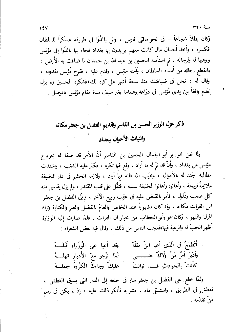 ولما ظن الوزير ابو الجمال الحسين بن القاسم ان الأمر قد صفا له بخروج مؤنس من بغداد، وان قد تم له ما اراد، وقع فيما تكره، فكثر عليه الشغب، واشتدت مطالبه الجند له بالأموال، وخيب الله ظنه فيما اراد، ولازمه الحشم في دار الخليفة ملازمه قبيحه، وأهانوه وأهانوا الخليفة بسببه، فثقل على قلب المقتدر، ولم يزل يقاسى منه كل صعب وذلول، فامر بالقبض عليه في عقب ربيع الآخر، وولى الفضل بن جعفر ابن الفرات مكانه، وقد كان مشهورا عند الخاص والعام بالفضل والعلم والكتابه وترك الهزل واللهو، وكان هو وابو الخطاب من خيار آل الفرات فلما صارت اليه الوزارة اظهر الحب له والرغبة فيها، فعجب الناس من ذلك، وقال فيه بعض الشعراء: