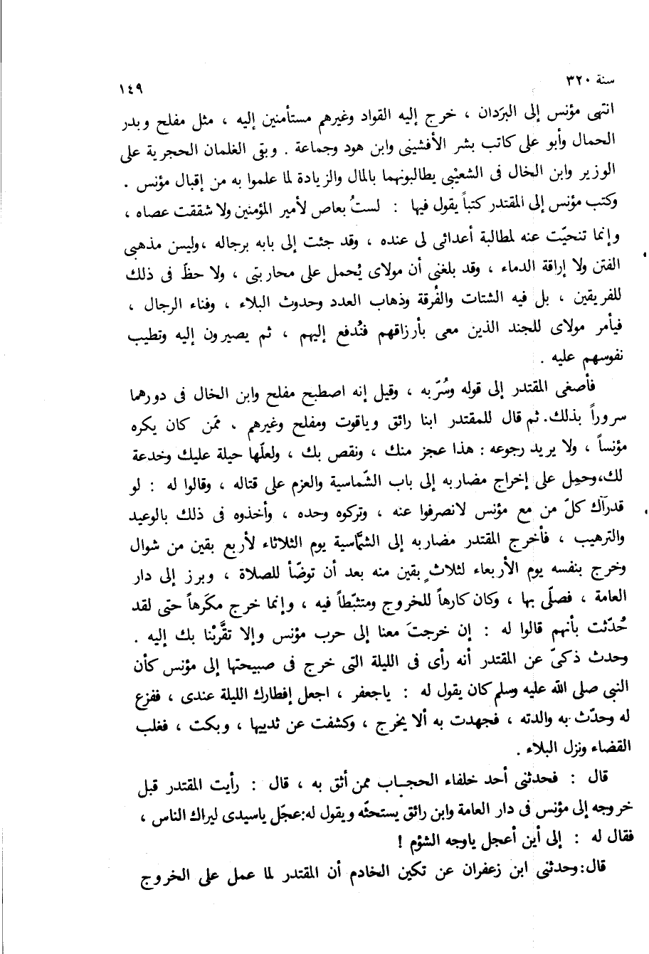 قال: فحدثني احد خلفاء الحجاب ممن أثق به، قال: رايت المقتدر قبل خروجه الى مؤنس في دار العامه وابن رائق يستحثه ويقول له: عجل يا سيدي ليراك الناس، فقال له: الى اين اعجل يا وجه الشؤم! قال: وحدثنى ابن زعفران عن تكين الخادم ان المقتدر لما عمل على الخروج