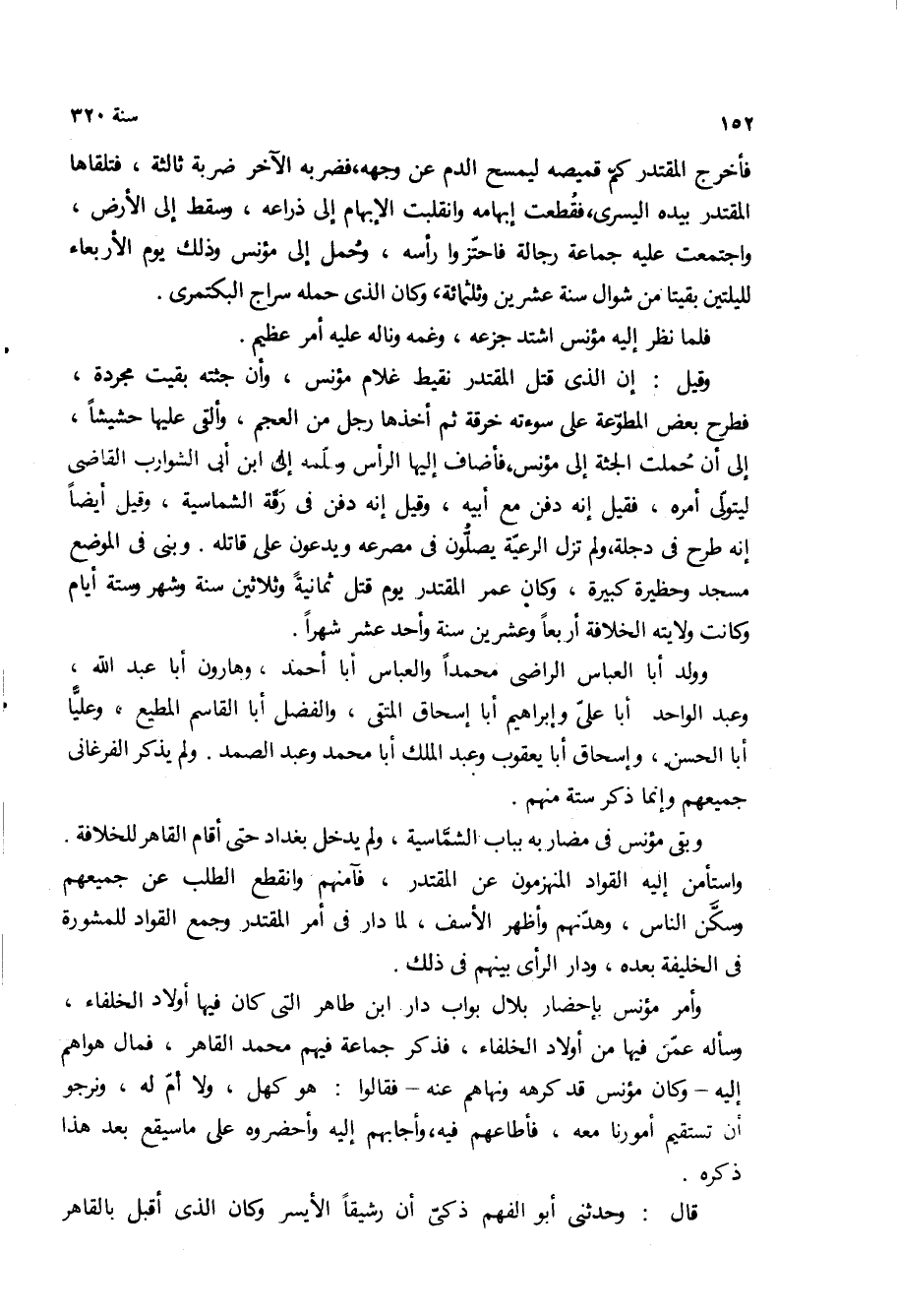 وامر مؤنس باحضار بلال بواب دار ابن طاهر التي كان فيها اولاد الخلفاء، وساله عمن فيها من اولاد الخلفاء، فذكر جماعه فيهم محمد القاهر، فمال هواهم اليه- وكان مؤنس قد كرهه ونهاهم عنه- فقالوا: هو كهل، ولا أم له، ونرجو ان تستقيم أمورنا معه، فاطاعهم فيه، وأجابهم اليه واحضروه على ما سيقع بعد هذا ذكره.