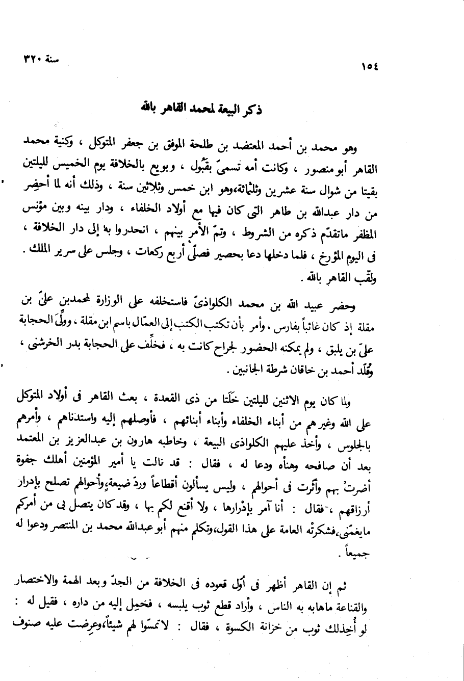 ولما كان يوم الاثنين لليلتين خلتا من ذي القعده، بعث القاهر في اولاد المتوكل على الله وغيرهم من أبناء الخلفاء وأبناء ابنائهم، فاوصلهم اليه واستدناهم، وامرهم بالجلوس، وأخذ عليهم الكلواذى البيعه، وخاطبه هارون بن عبد العزيز بن المعتمد بعد ان صافحه وهناه ودعا له، فقال: قد نالت يا امير المؤمنين اهلك جفوه اضرت بهم واثرت في أحوالهم، وليس يسألون اقطاعا ورد ضيعه، وأحوالهم تصلح بادرار أرزاقهم، فقال: انا آمر بادرارها، ولا اقنع لكم بها، وقد كان يتصل بي من امركم ما يغمنى، فشكرته العامه على هذا القول، وتكلم منهم ابو عبد الله محمد بن المنتصر ودعوا له جميعا.