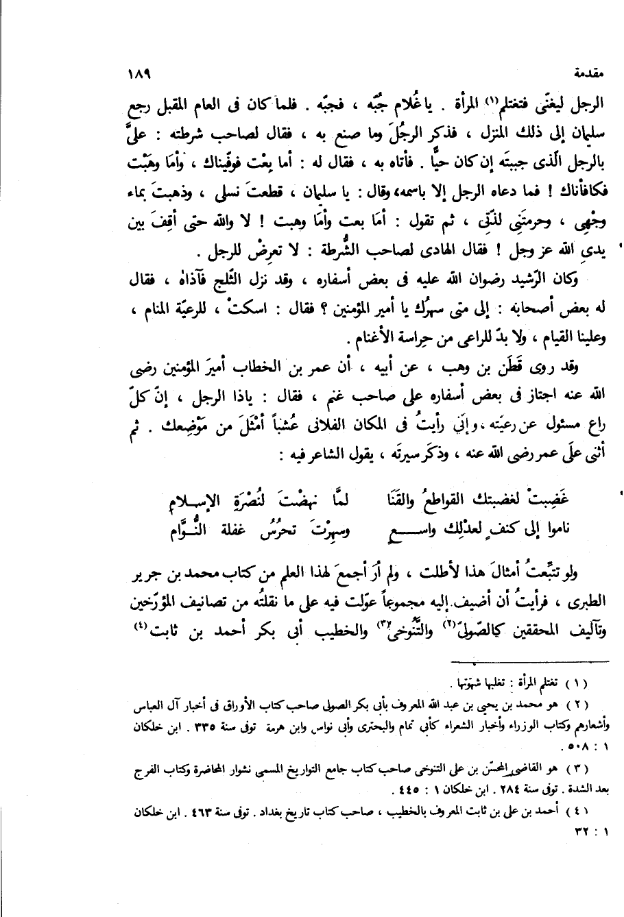 ولو تتبعت امثال هذا لأطلت، ولم أر اجمع لهذا العلم من كتاب محمد بن جرير الطبرى، فرايت ان اضيف اليه مجموعا عولت فيه على ما نقلته من تصانيف المؤرخين وتاليف المحققين كالصولى والتنوخي والخطيب ابى بكر احمد بن ثابت