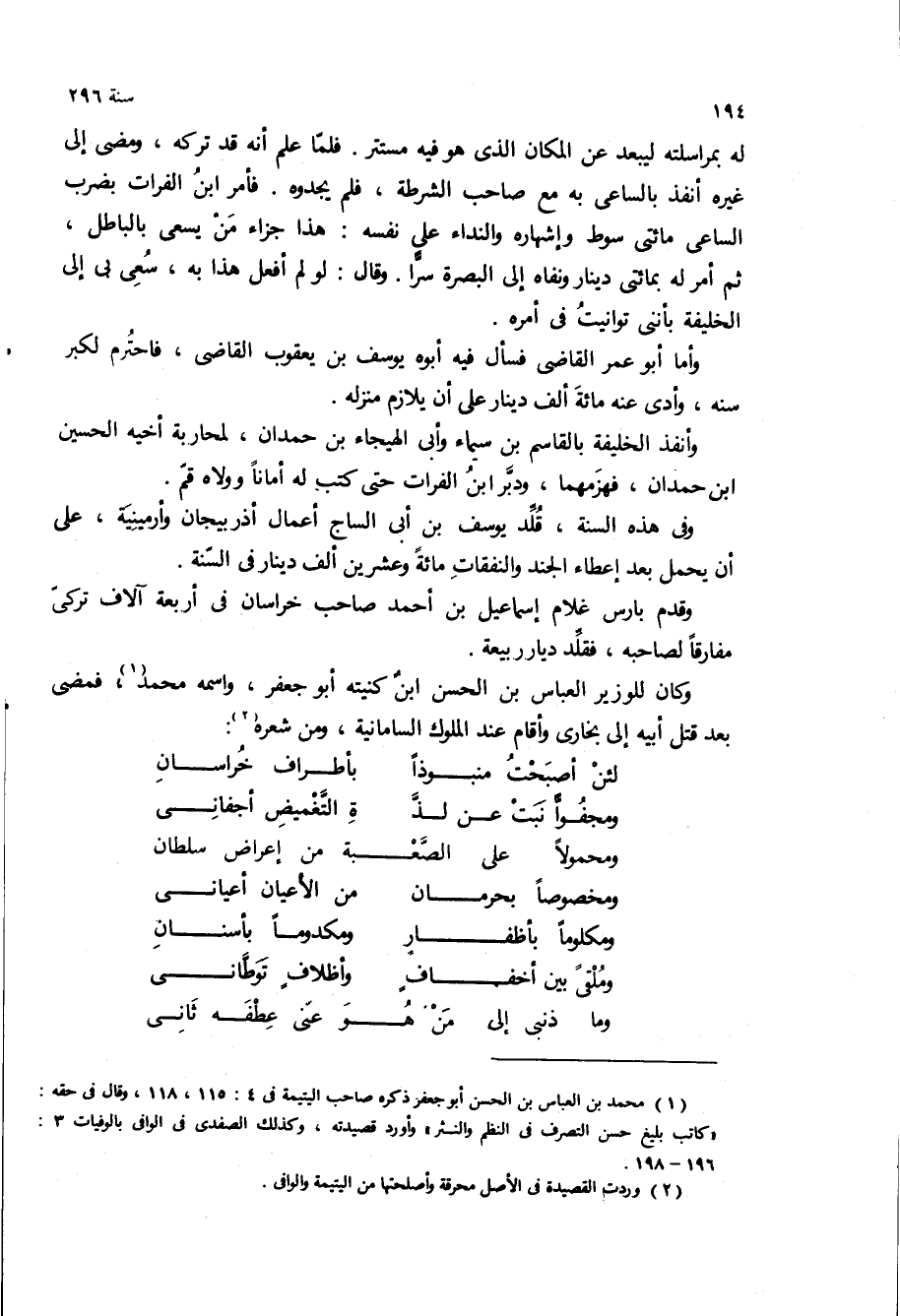 له بمراسلته ليبعد عن المكان الذى هو فيه مستتر فلما علم انه قد تركه، ومضى الى غيره انفذ بالساعى به مع صاحب الشرطه، فلم يجدوه فامر ابن الفرات بضرب الساعى مائتي سوط واشهاره والنداء على نفسه: هذا جزاء من يسعى بالباطل، ثم امر له بمائتي دينار ونفاه الى البصره سرا وقال: لو لم افعل هذا به، سعى بي الى الخليفة بأنني توانيت في امره.
