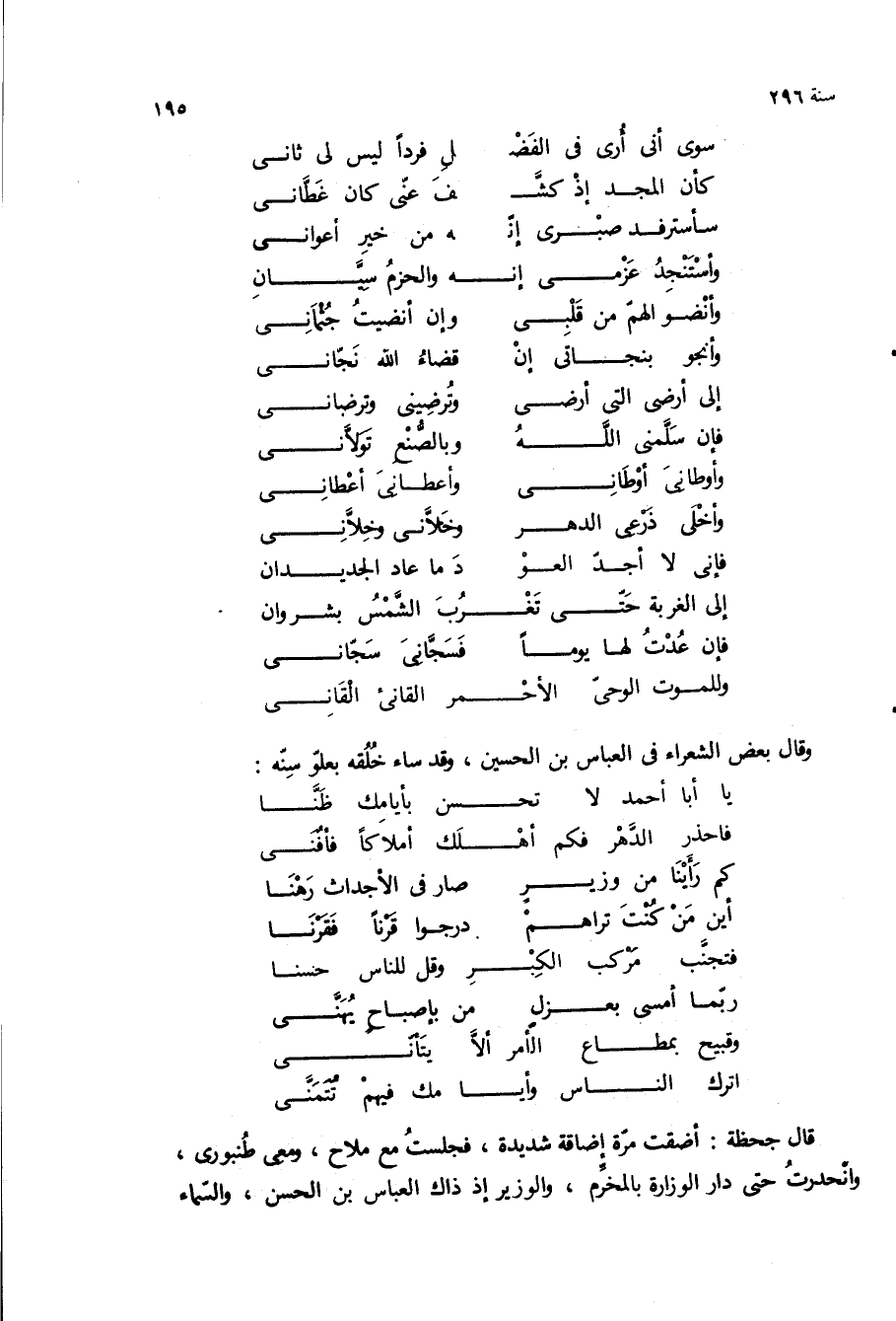 قال جحظه: اضقت مره اضاقه شديده، فجلست مع ملاح، ومعى طنبورى، وانحدرت حتى دار الوزارة بالمخرم، والوزير إذ ذاك العباس بن الحسن، والسماء