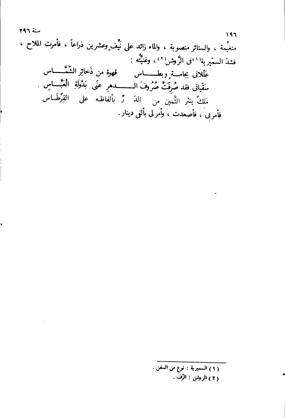 متغيمه، والستائر منصوبه، والماء زائد على نيف وعشرين ذراعا، فأمرت الملاح، فشد السميريه في الروشن، وغنيته:
