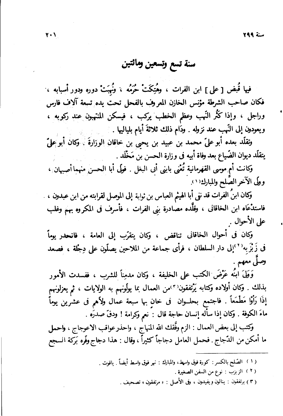 فيها قبض على ابن الفرات، وهتكت حرمه، ونهبت دوره ودور أسبابه، فكان صاحب الشرطه مؤنس الخازن المعروف بالفحل تحت يده تسعه آلاف فارس وراجل، وإذا كثر النهب وعظم الخطب يركب، فيسكن المنتهبون عند ركوبه، ويعودون الى النهب عند نزوله ودام ذلك ثلاثة ايام بلياليها.