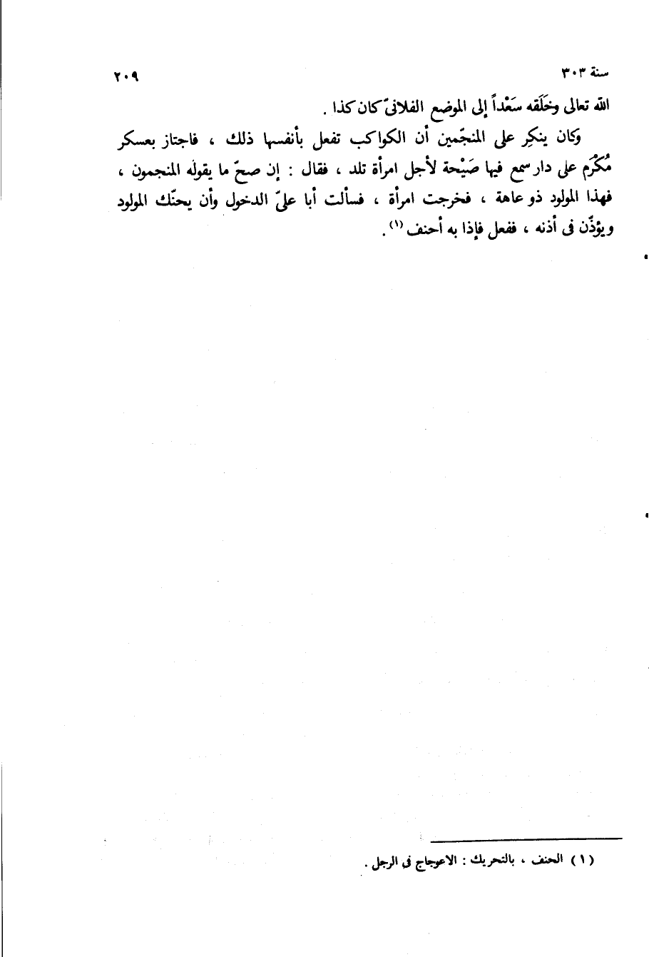 وكان ينكر على المنجمين ان الكواكب تفعل بأنفسها ذلك، فاجتاز بعسكر مكرم على دار سمع فيها صيحه لأجل امراه تلد، فقال: ان صح ما يقوله المنجمون، فهذا المولود ذو عاهة، فخرجت امراه، فسالت أبا على الدخول وان يحنك المولود ويؤذن في اذنه، ففعل فإذا به احنف