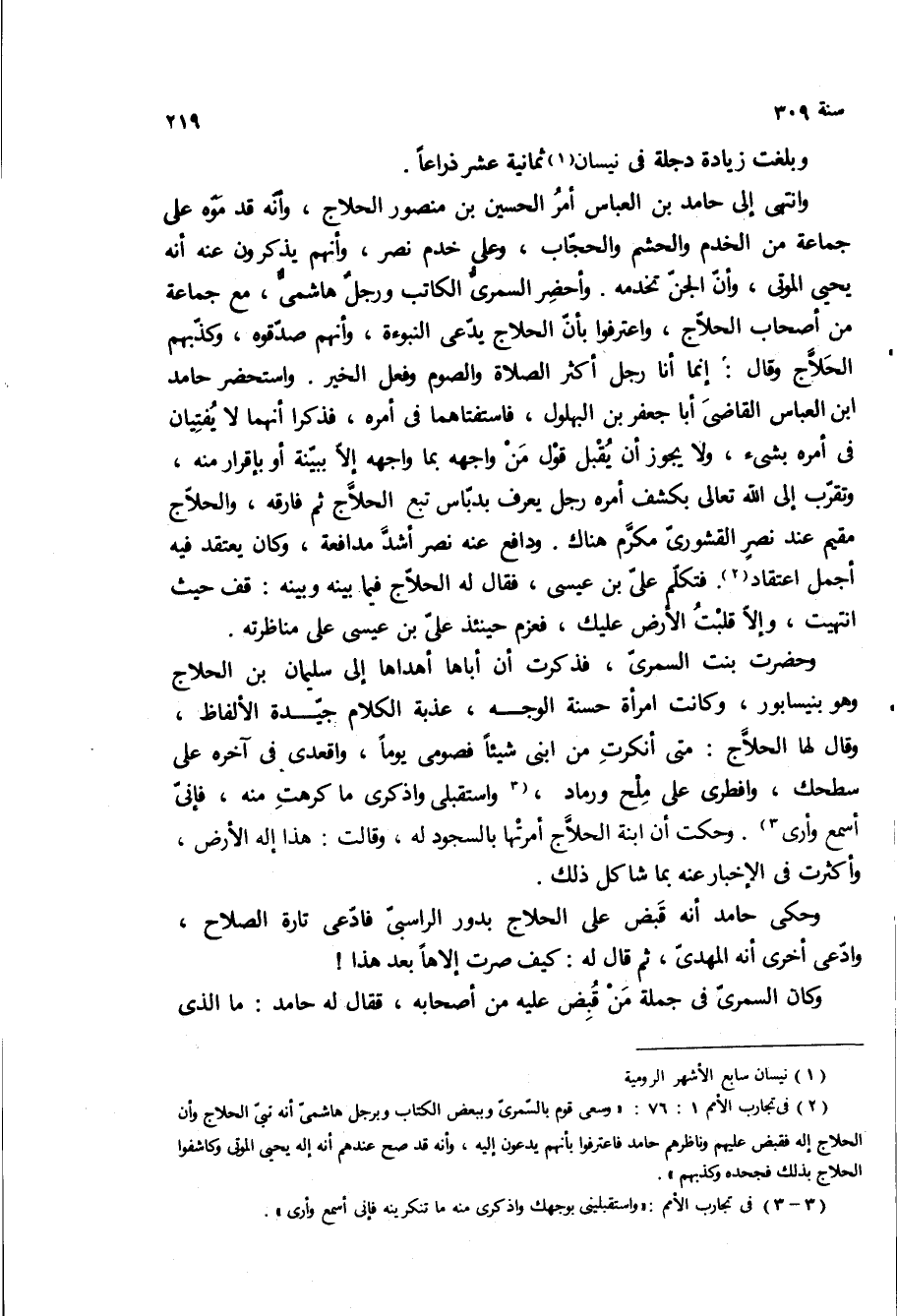وانتهى الى حامد بن العباس امر الحسين بن منصور الحلاج، وانه قدموه على جماعه من الخدم والحشم والحجاب، وعلى خدم نصر، وانهم يذكرون عنه انه يحيى الموتى، وان الجن تخدمه واحضر السمري الكاتب ورجل هاشمي، مع جماعه من اصحاب الحلاج، واعترفوا بان الحلاج يدعى النبوه، وانهم صدقوه، وكذبهم الحلاج وقال: انما انا رجل اكثر الصلاة والصوم وفعل الخير واستحضر حامد ابن العباس القاضى أبا جعفر بن البهلول، فاستفتاهما في امره، فذكرا انهما لا يفتيان في امره بشيء، ولا يجوز ان يقبل قول من واجهه بما واجهه الا ببينه او باقرار منه، وتقرب الى الله تعالى بكشف امره رجل يعرف بدباس تبع الحلاج ثم فارقه، والحلاج مقيم عند نصر القشورى مكرم هناك ودافع عنه نصر أشد مدافعه، وكان يعتقد فيه اجمل اعتقاد فتكلم على بن عيسى، فقال له الحلاج فيما بينه وبينه: قف حيث انتهيت، والا قلبت الارض عليك، فعزم حينئذ على بن عيسى على مناظرته.