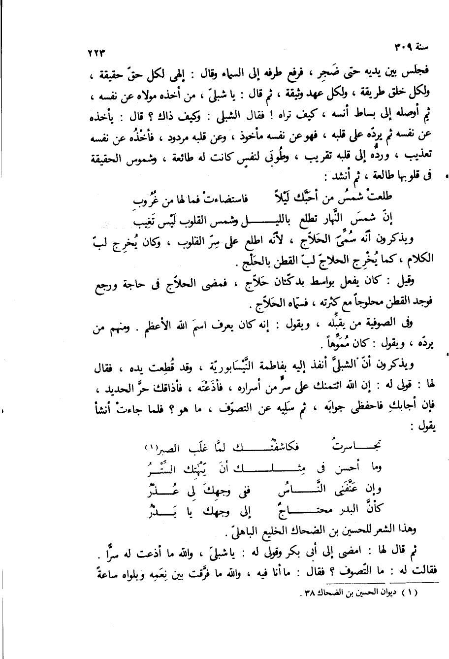 ويذكرون ان الشبلى انفذ اليه بفاطمه النيسابوريه، وقد قطعت يده، فقال لها: قولي له: ان الله ائتمنك على سر من اسراره، فاذعته، فاذاقك حر الحديد، فان أجابك فاحفظى جوابه، ثم سليه عن التصوف، ما هو؟ فلما جاءت أنشأ يقول: