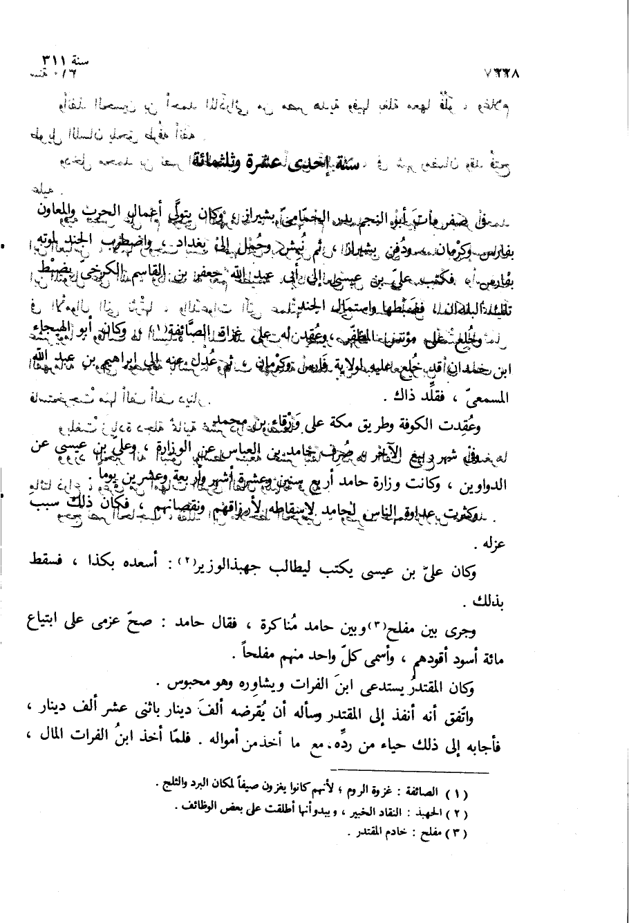 وفي شهر ربيع الآخر، صرف حامد بن العباس عن الوزارة، وعلى بن عيسى عن الدواوين، وكانت وزارة حامد اربع سنين وعشره اشهر واربعه وعشرين يوما.