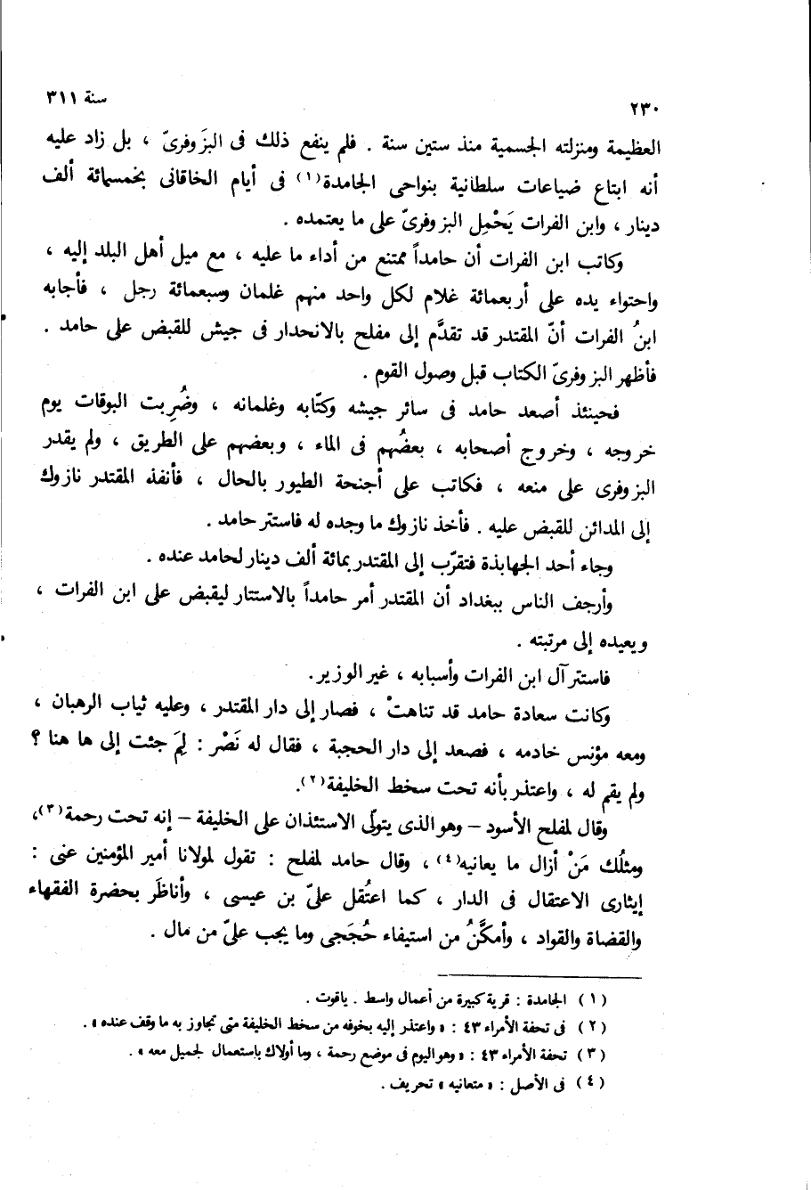 العظيمه ومنزلته الجسمية منذ ستين سنه فلم ينفع ذلك في البزوفري، بل زاد عليه انه ابتاع ضياعات سلطانيه بنواحي الجامدة في ايام الخاقانى بخمسمائة الف دينار، وابن الفرات يحمل البزوفري على ما يعتمده.