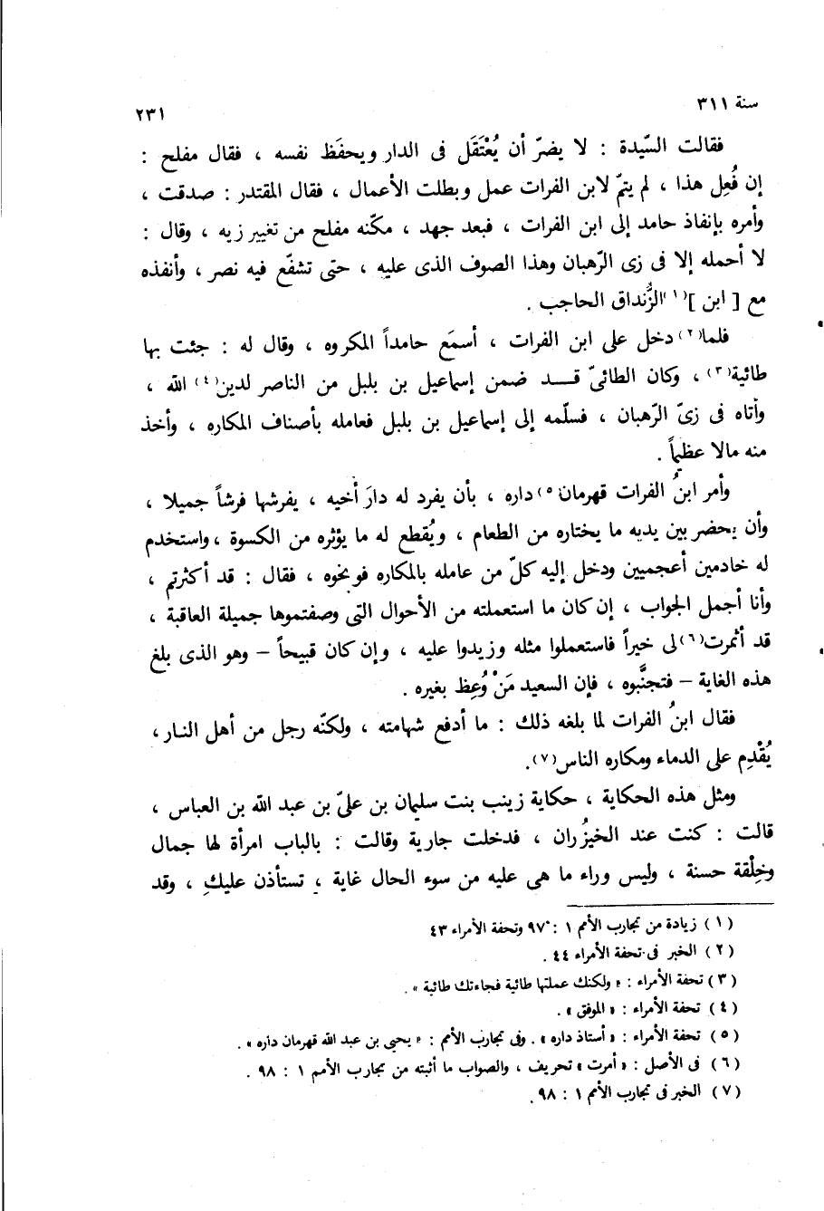 ان فعل هذا، لم يتم لابن الفرات عمل وبطلت الاعمال، فقال المقتدر: صدقت، وامره بانفاذ حامد الى ابن الفرات، فبعد جهد، مكنه مفلح من تغيير زيه، وقال: