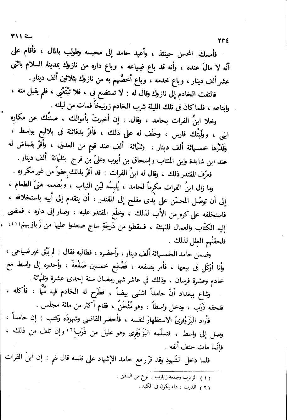 وخلا ابن الفرات بحامد، وقال: ان اخبرت باموالك، صنتك عن مكاره ابنى، ووليتك فارس، وحلف له على ذلك، فاقر بدفائنه في بلاليع بواسط، وقدرها خمسمائة الف دينار، وثلاثمائة الف عند قوم من العدول، واقر بقماش له عند ابن شابده وابن المنتاب وإسحاق بن أيوب وعلى بن فرج بثلاثمائة الف دينار.