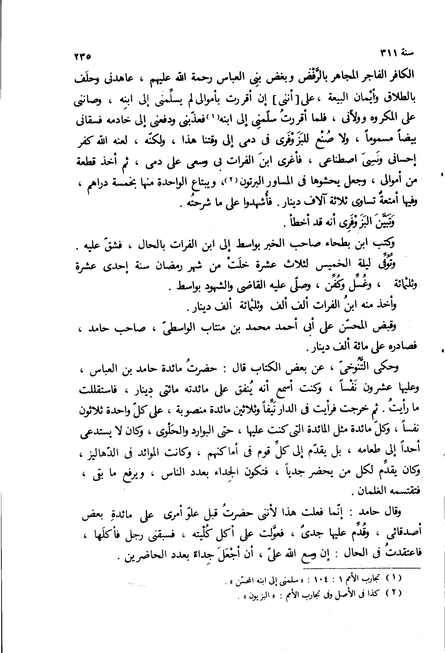الكافر الفاجر المجاهر بالرفض وبغض بنى العباس رحمه الله عليهم، عاهدني وحلف بالطلاق وايمان البيعه، على اننى ان اقررت بأموالي لم يسلمني الى ابنه، وصانني على المكروه وولانى، فلما اقررت سلمني الى ابنه فعذبني ودفعنى الى خادمه فسقاني بيضا مسموما، ولا صنع للبزوفرى في دمى الى وقتنا هذا، ولكنه، لعنه الله كفر إحساني ونسى اصطناعى، فاغرى ابن الفرات بي وسعى على دمى، ثم أخذ قطعه من أموالي، وجعل يحشوها في المساور البرتون، ويبتاع الواحدة منها بخمسه دراهم، وفيها امتعه تساوى ثلاثة آلاف دينار فاشهدوا على ما شرحته.