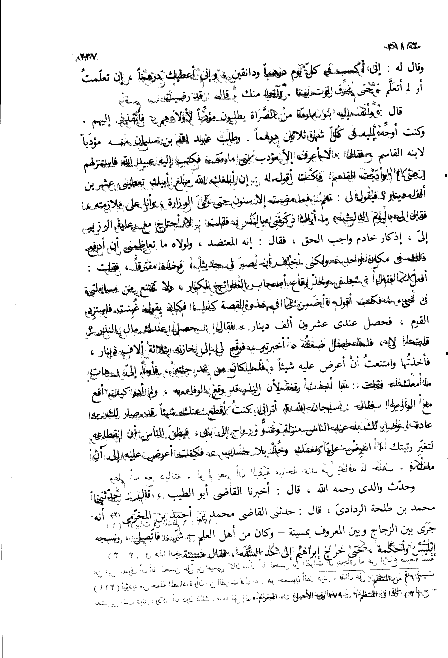 قلت: لا، فلما حصل ضعفه، اخبرته، فوقع لي الى خازنه بثلاثة الاف دينار، فأخذتها وامتنعت ان اعرض عليه شيئا فلما كان من غد جئته، فأومأ الى، هات ما معك، فقلت: ما أخذت رقعه لان النذر قد وقع الوفاء به، ولم ادر كيف أقع مع الوزير! فقال: سبحان الله! اترانى كنت اقطع عنك شيئا قد صار لك به عاده، وصار لك به عند الناس منزله وغدو ورواح الى بابى، فيظن الناس ان انقطاعه لتغير رتبتك! اعرض على رسمك وخذ بلا حساب، فكنت اعرض عليه الى ان مات.