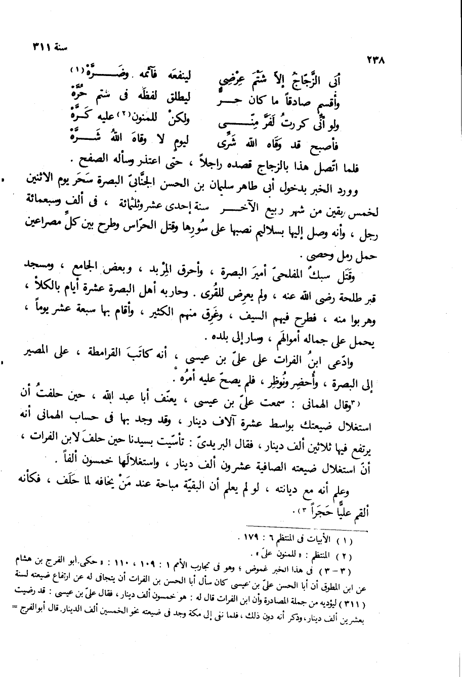 وورد الخبر بدخول ابى طاهر سليمان بن الحسن الجنابى البصره سحر يوم الاثنين لخمس بقين من شهر ربيع الآخر سنة إحدى عشر وثلاثمائة، في الف وسبعمائة رجل، وانه وصل إليها بسلاليم نصبها على سورها وقتل الحراس وطرح بين كل مصراعين حمل رمل وحصى.