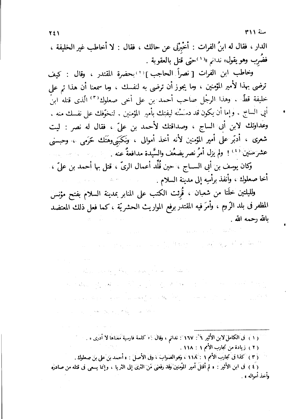 وخاطب ابن الفرات نصرا الحاجب بحضره المقتدر، وقال: كيف ترضى بهذا لأمير المؤمنين، وما يجوز ان ترضى به لنفسك، وما سمعنا ان هذا تم على خليفه قط، وهذا الرجل صاحب احمد بن على أخي صعلوك الذى قتله ابن ابى الساج، واما ان يكون قد دسسته ليفتك بامير المؤمنين، لتخوفك على نفسك منه.