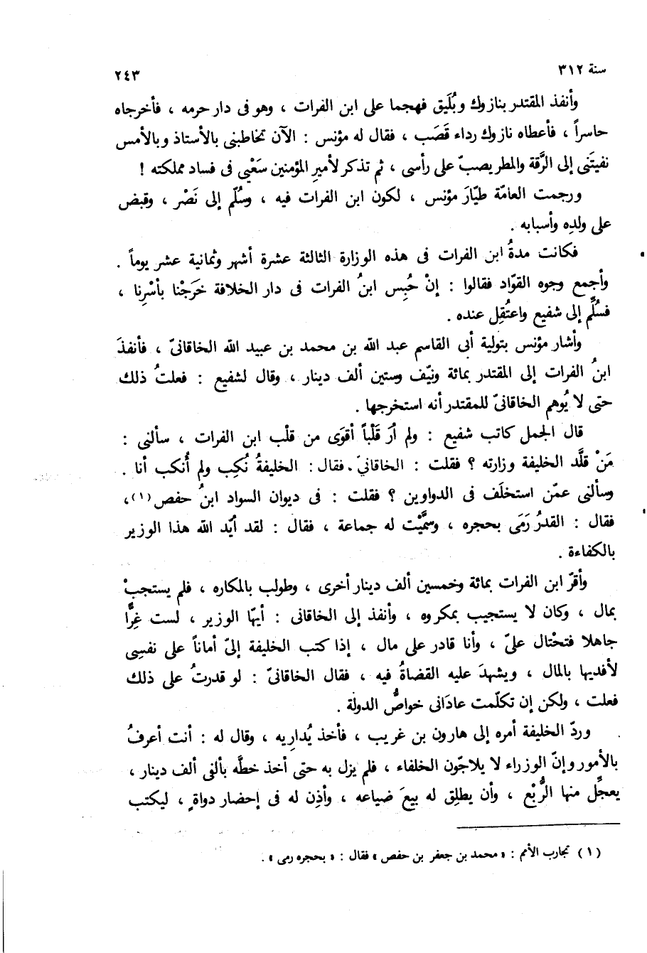 واشار مؤنس بتوليه ابى القاسم عبد الله بن محمد بن عبيد الله الخاقانى، فانفذ ابن الفرات الى المقتدر بمائه ونيف وستين الف دينار، وقال لشفيع: فعلت ذلك حتى لا يوهم الخاقانى للمقتدر انه استخرجها.