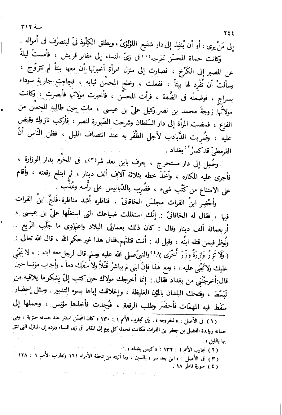 وَلا تَزِرُ وازِرَةٌ وِزْرَ أُخْرى * [والنبي صلى الله عليه وسلم قال لرجل معه ابنه: لا يجنى عليك ولا تجنى عليه،] ومع هذا فان ابنى لم يباشر قتلا ولا سفك دما، وأجاب مؤنسا حين قال: اخرجتنى من بغداد فقال: انما اخرجك مولاك حين كتب الى يشكو ما يلاقيه من تبسط، وفتحك البلدان بالمؤن الغليظة، واغلاقك إياها بسوء التدبير: وسئل احضار سفط فيه المهمات فاحضر وطلب الرقعة، فوجدت فأخذها مؤنس، وحملها الى