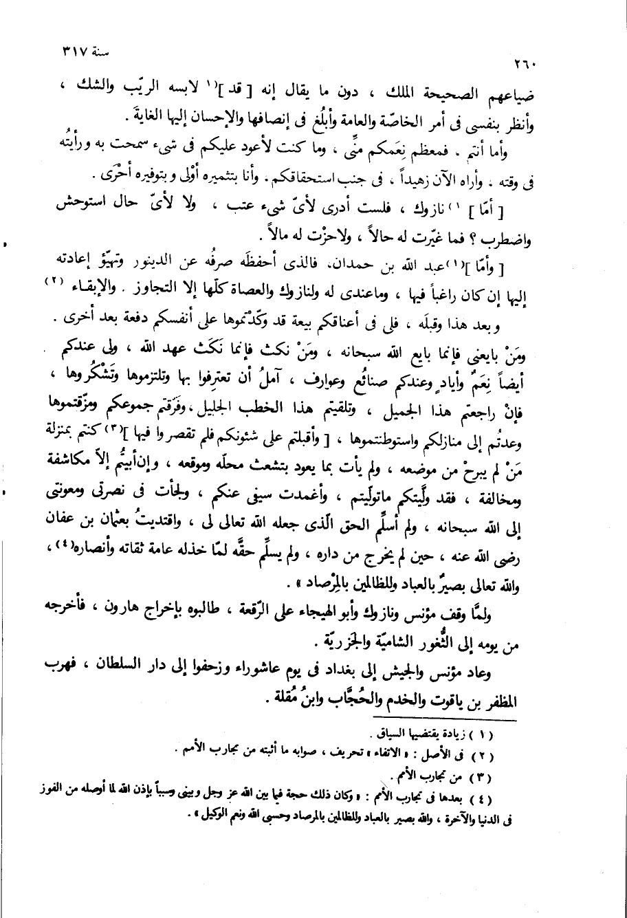 واما عبد الله بن حمدان، فالذي احفظه صرفه عن الدينور وتهيؤ اعادته إليها ان كان راغبا فيها، وما عندي له ولنازوك والعصاة كلها الا التجاوز والإبقاء وبعد هذا وقبله، فلي في أعناقكم بيعه قد وكدتموها على انفسكم دفعه بعد اخرى.
