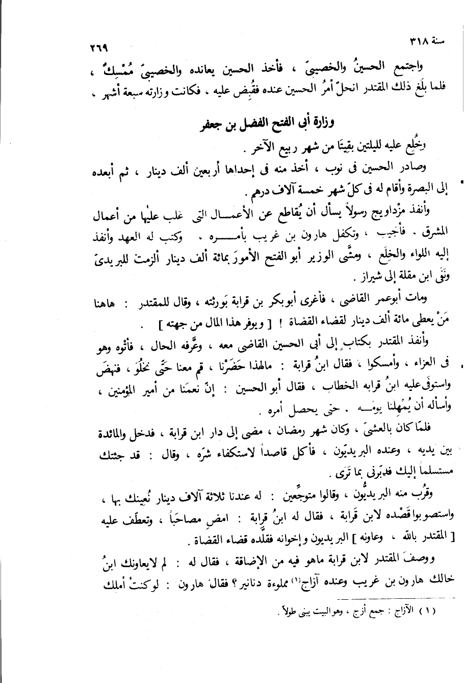 واجتمع الحسين والخصيبى، فاخذ الحسين يعانده والخصيبى ممسك، فلما بلغ ذلك المقتدر انحل امر الحسين عنده فقبض عليه، فكانت وزارته سبعه اشهر