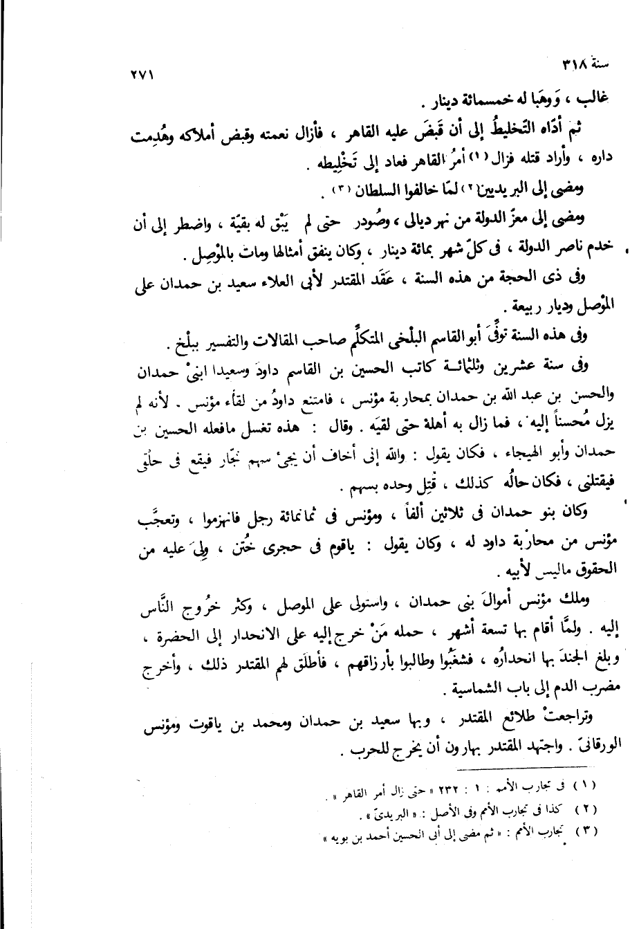 وملك مؤنس اموال بنى حمدان، واستولى على الموصل، وكثر خروج الناس اليه ولما اقام بها تسعه اشهر، حمله من خرج اليه على الانحدار الى الحضره، وبلغ الجند بها انحداره، فشغبوا وطالبوا بأرزاقهم، فاطلق لهم المقتدر ذلك، واخرج مضرب الدم الى باب الشماسيه.