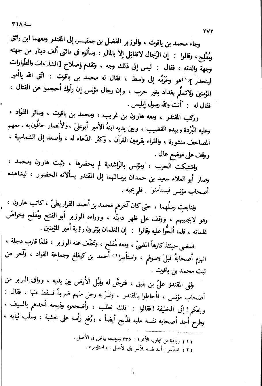 وتتابعت رسلهما، حتى كان آخرهم محمد بن احمد القراريطى، كاتب هارون، وهو لا يجيبهم، ووقف على ظهر دابته، ووراءه الوزير ابو الفتح ومفلح وخواص غلمانه، فلما ألحوا عليه وقالوا: ان الغلمان يؤثرون رؤية امير المؤمنين.