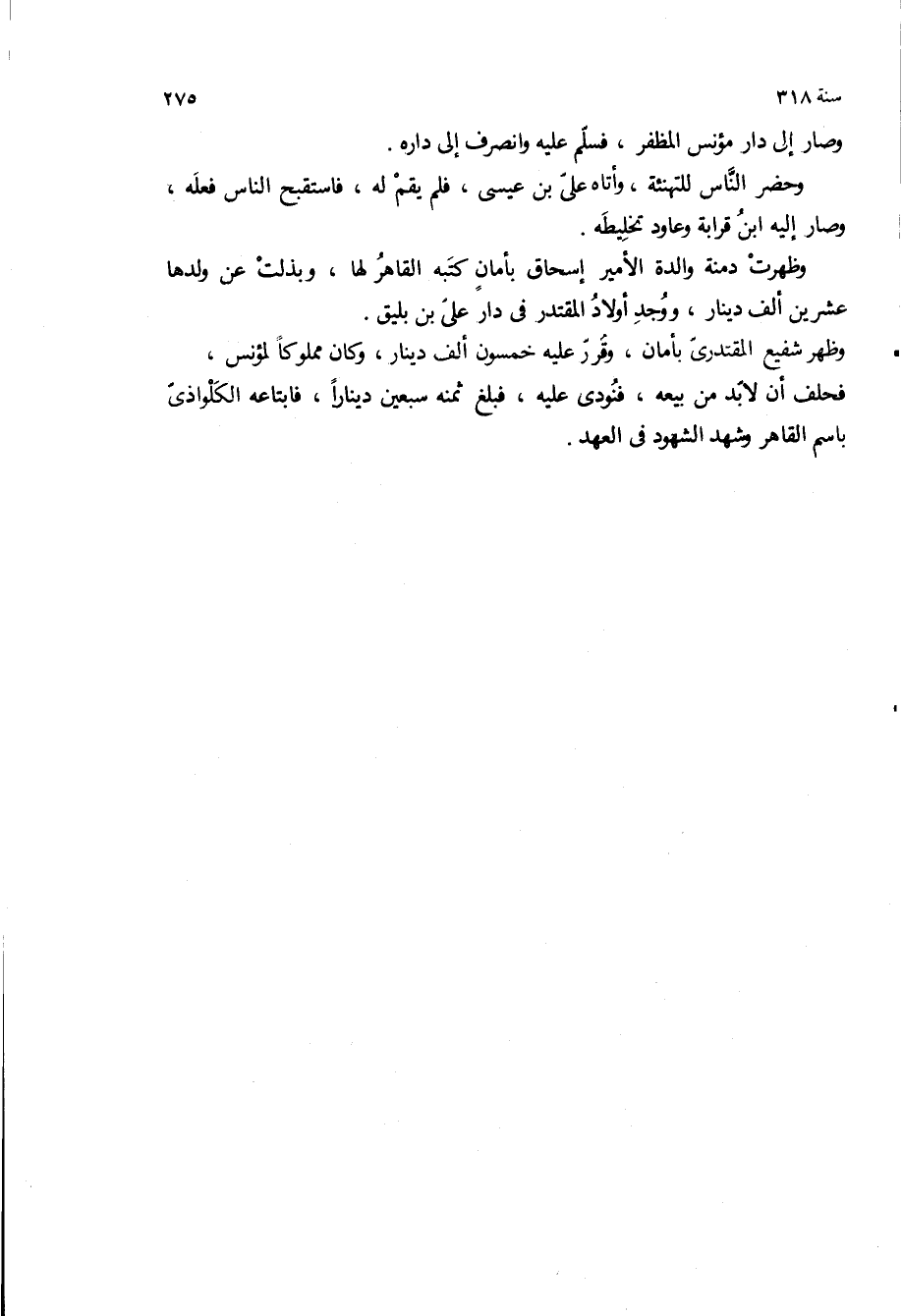 وظهر شفيع المقتدرى بأمان، وقرر عليه خمسون الف دينار، وكان مملوكا لمؤنس، فحلف ان لا بد من بيعه، فنودي عليه، فبلغ ثمنه سبعين دينارا، فابتاعه الكلواذى باسم القاهر وشهد الشهود في العهد.