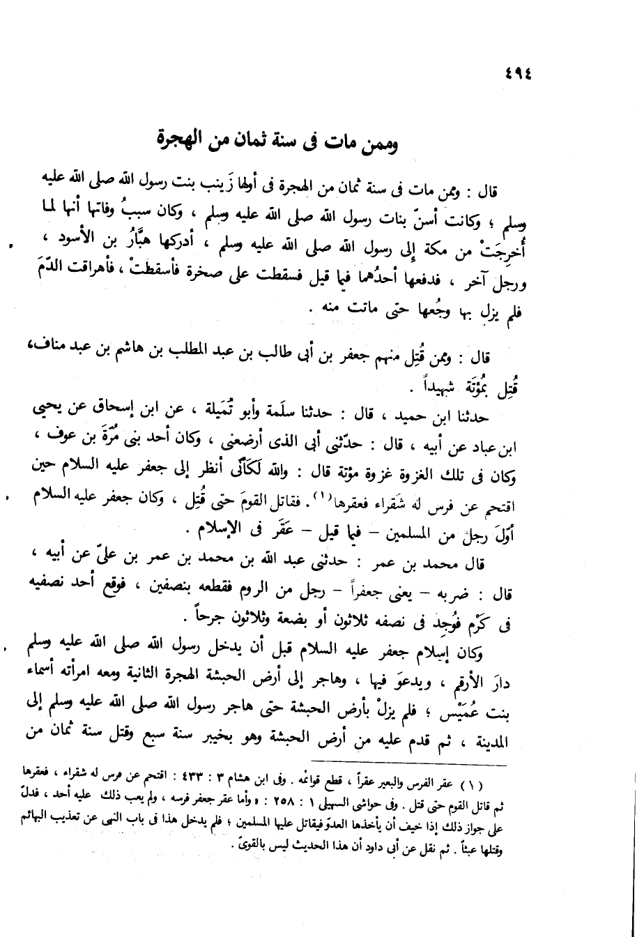 حَدَّثَنَا ابْنُ حُمَيْدٍ، قَالَ: حَدَّثَنَا سَلَمَةُ وابو تميله، عن ابن إسحاق عن يحيى ابن عَبَّادٍ عَنْ أَبِيهِ، قَالَ: حَدَّثَنِي أَبِي الَّذِي أَرْضَعَنِي، وَكَانَ أَحَدَ بَنِي مُرَّةَ بْنِ عَوْفٍ، وَكَانَ فِي تِلْكَ الْغَزْوَةِ غَزْوَةَ مُؤْتَةَ قَالَ: والله لكأني انظر الى جعفر ع حِينَ اقْتَحَمَ عَنْ فَرَسٍ لَهُ شَقْرَاءَ فَعَقَرَهَا، فقاتل القوم حتى قتل، وكان جعفر ع أول رجل من المسلمين- فيما قيل- عقر في الاسلام.