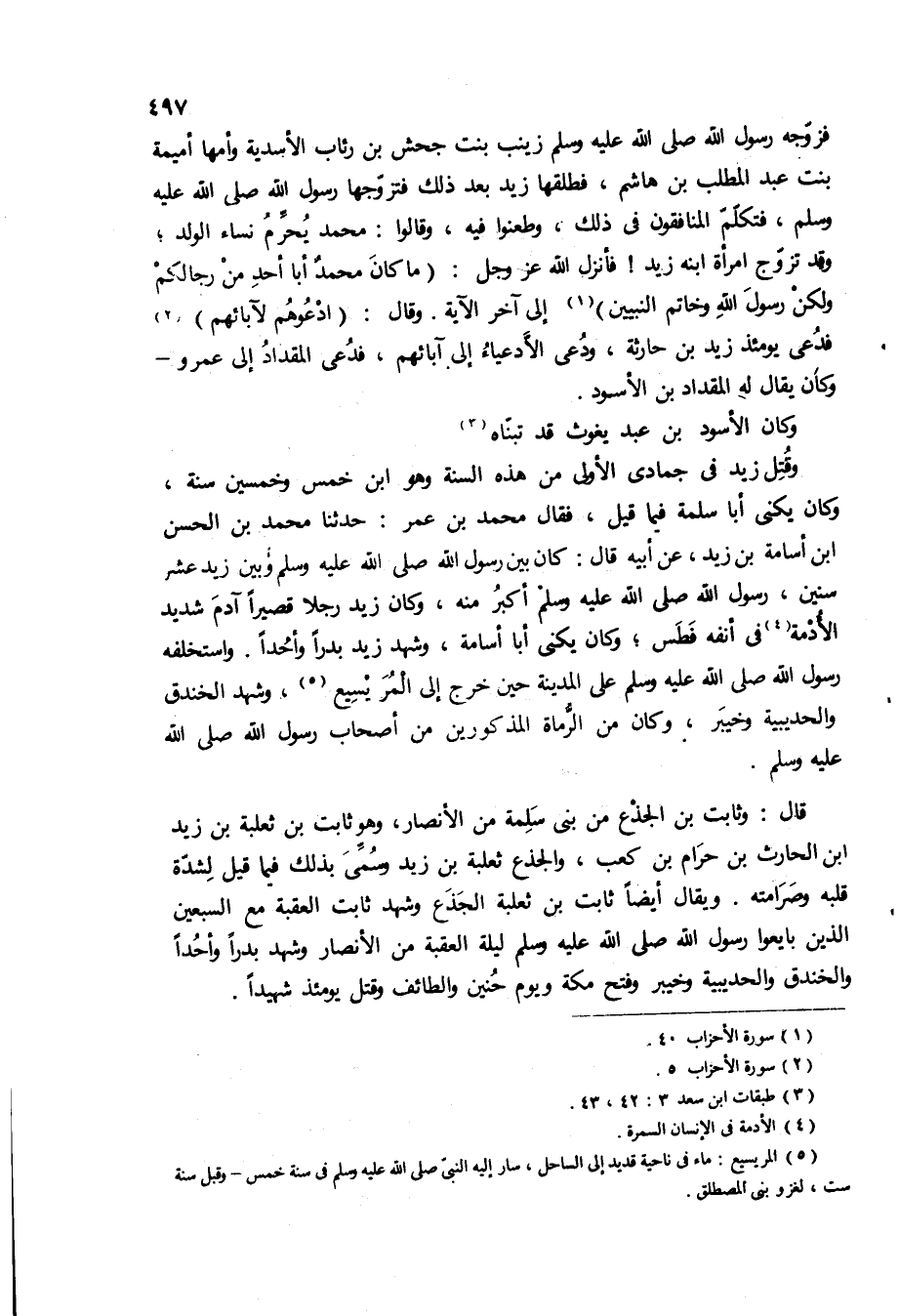 فزوجه رسول الله ص زينب بنت جحش بن رئاب الأسدية وأمها اميمه بنت عبد المطلب بن هاشم، فطلقها زيد بعد ذلك فتزوجها رسول الله ص، فتكلم المنافقون في ذلك، وطعنوا فيه، وقالوا: محمد يحرم نساء الولد، وقد تزوج امراه ابنه زيد! فانزل الله عز وجل: مَا كانَ مُحَمَّدٌ أَبا أَحَدٍ مِنْ رِجالِكُمْ وَلكِنْ رَسُولَ اللَّهِ وَخاتَمَ النَّبِيِّينَ الى آخر الآية وقال: ادْعُوهُمْ لِآبائِهِمْ فدعى يومئذ زيد بن حارثة، ودعى الأدعياء الى آبائهم، فدعى المقداد الى عمرو- وكان يقال له المقداد بن الأسود.